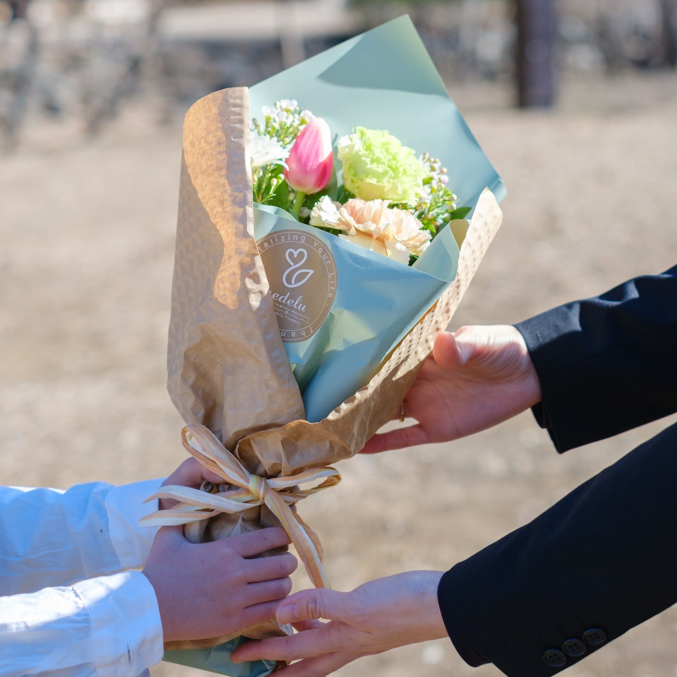 そこで保護者の方や式をまとめる役員の方たちを応援したいという想いで今回のブーケを企画しました。