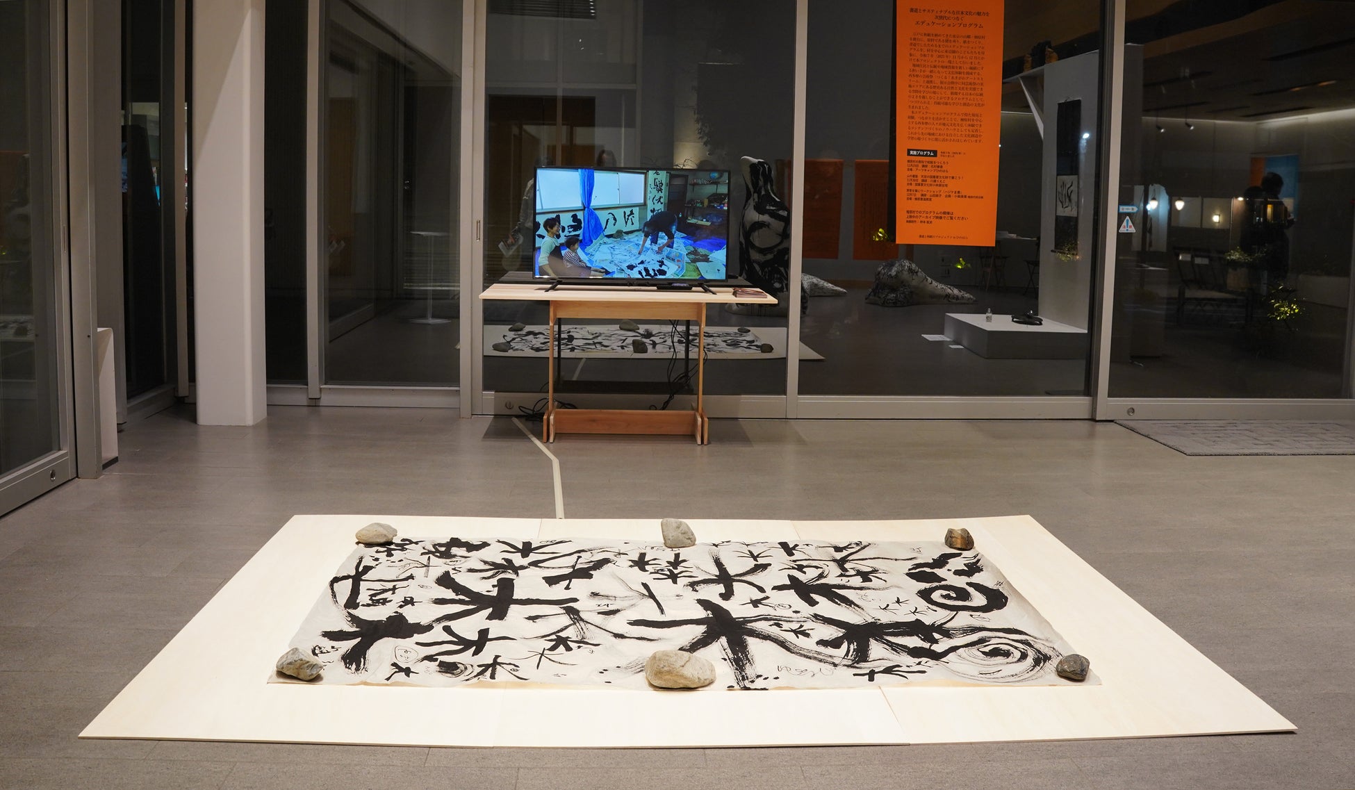 川邉りえこ氏主宰で行われた、このためにつくられた大きな檜原産和紙に子どもたちがしたためた成果作品も展示され、鑑賞と実践を往復するかたちで、書文化の継承と更新の可能性が示されました。