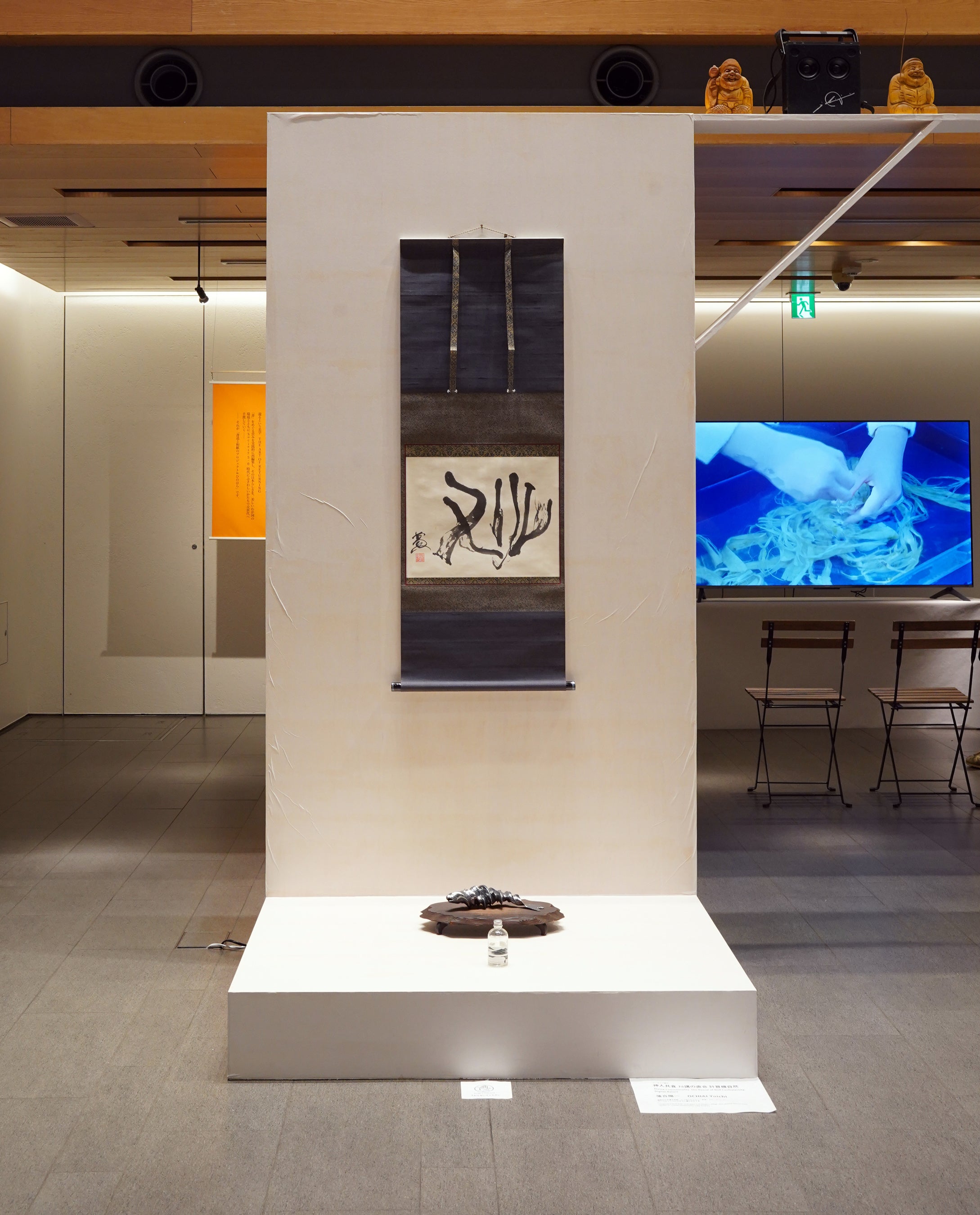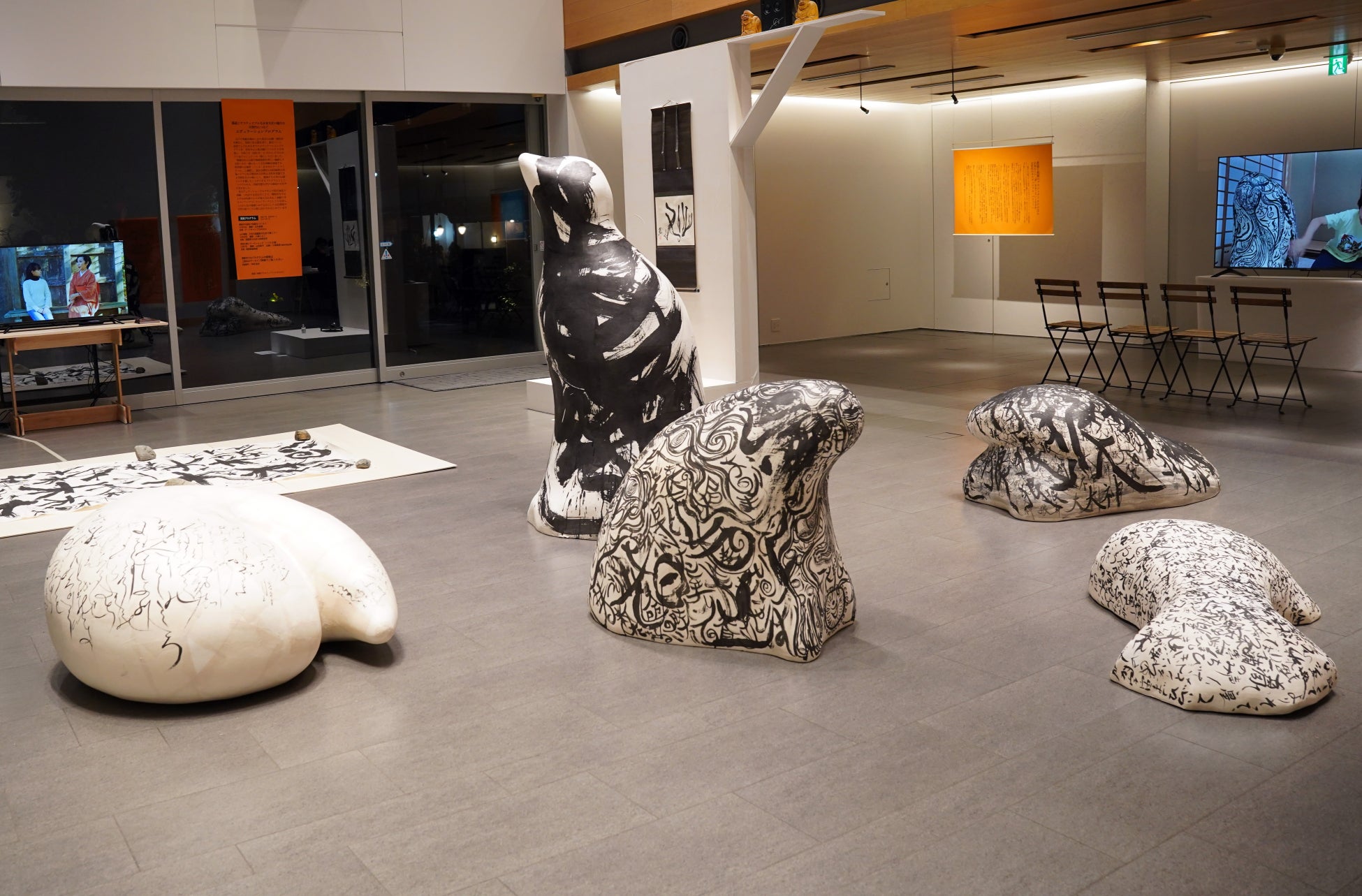 また、会場においては檜原村での取り組みにより生まれた、落合を含む「現代文人」たちの手による複数の書によるアート作品や川邉によるワークショップの成果作品の展示が行われ、「書」を文字表現にとどめず、空間・身体・素材・思想を横断する表現として再解釈する試みが展示されました。
