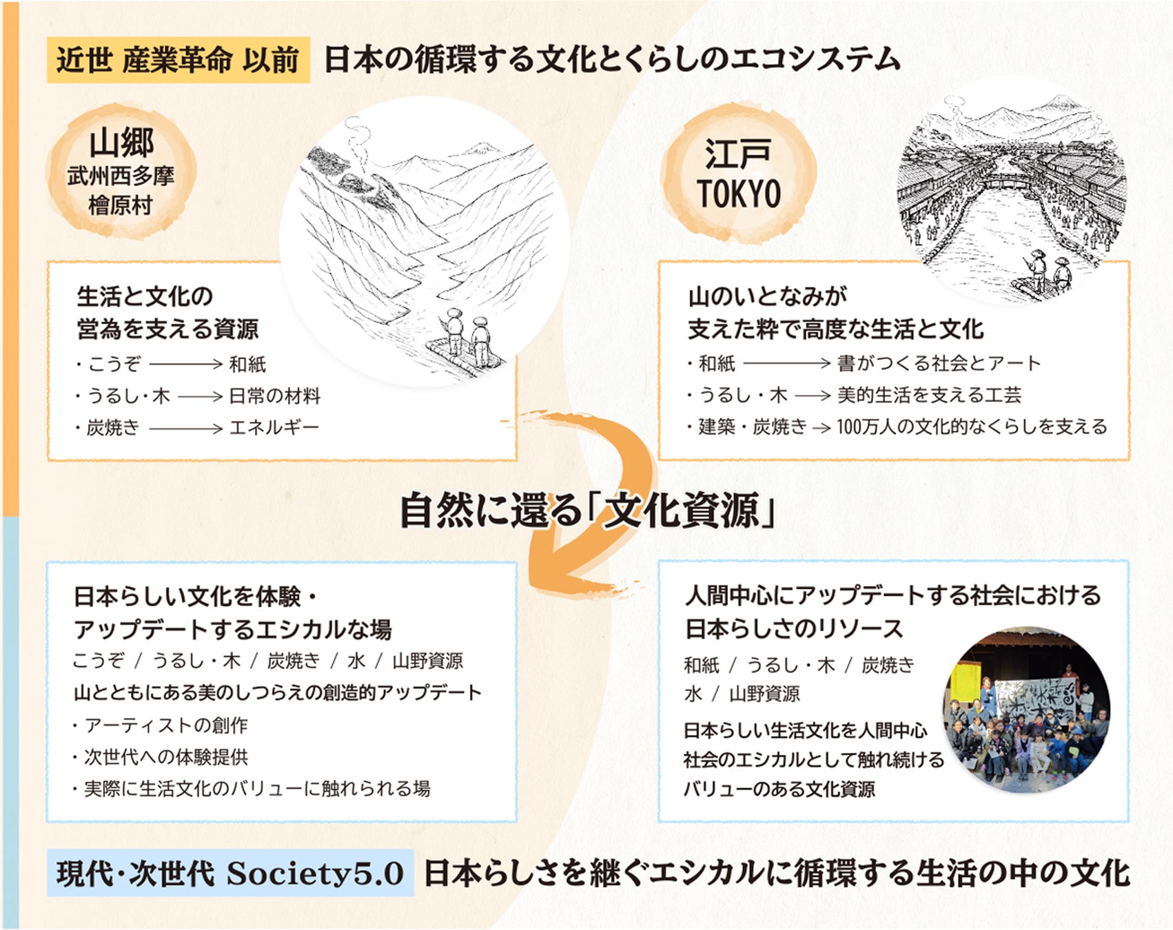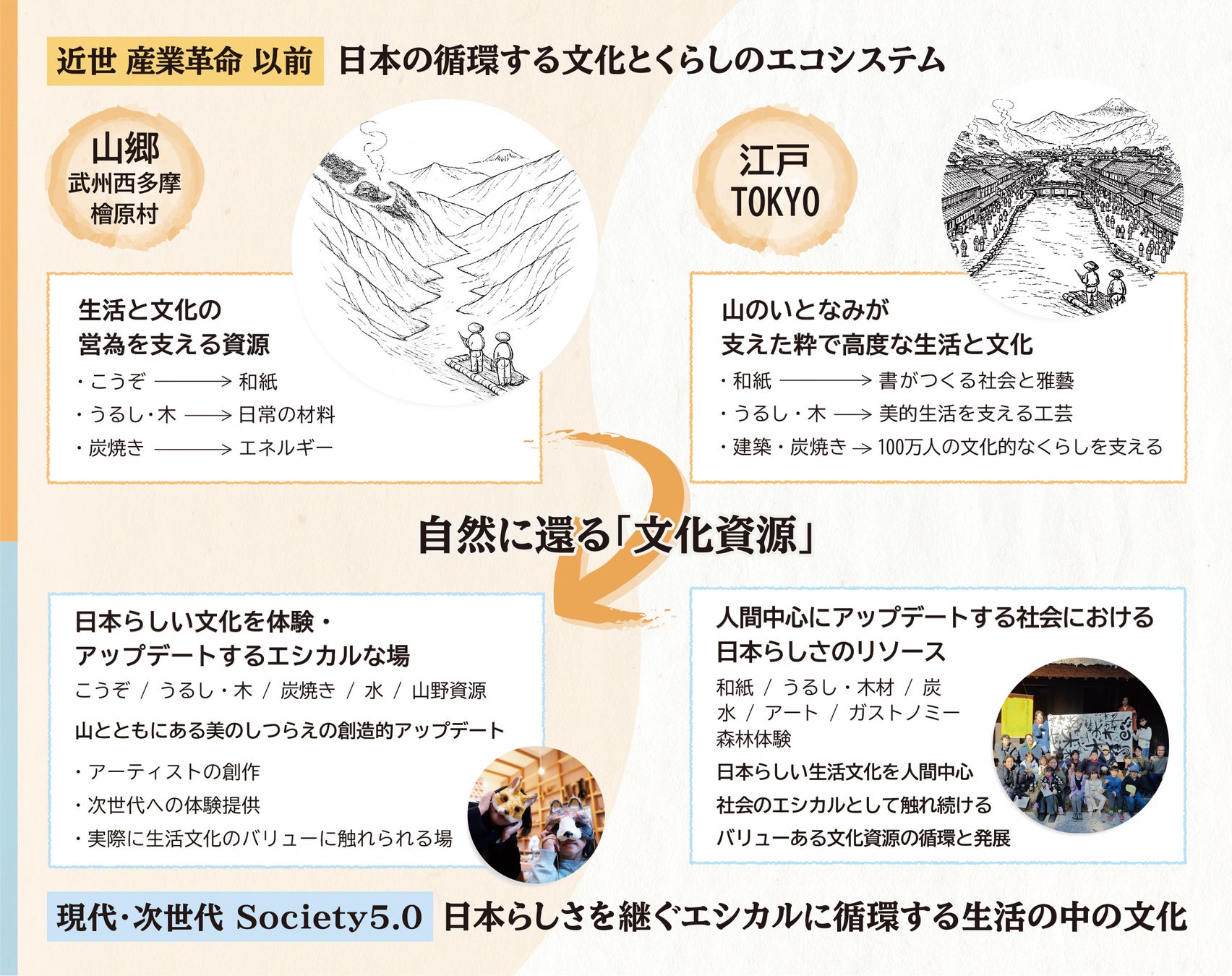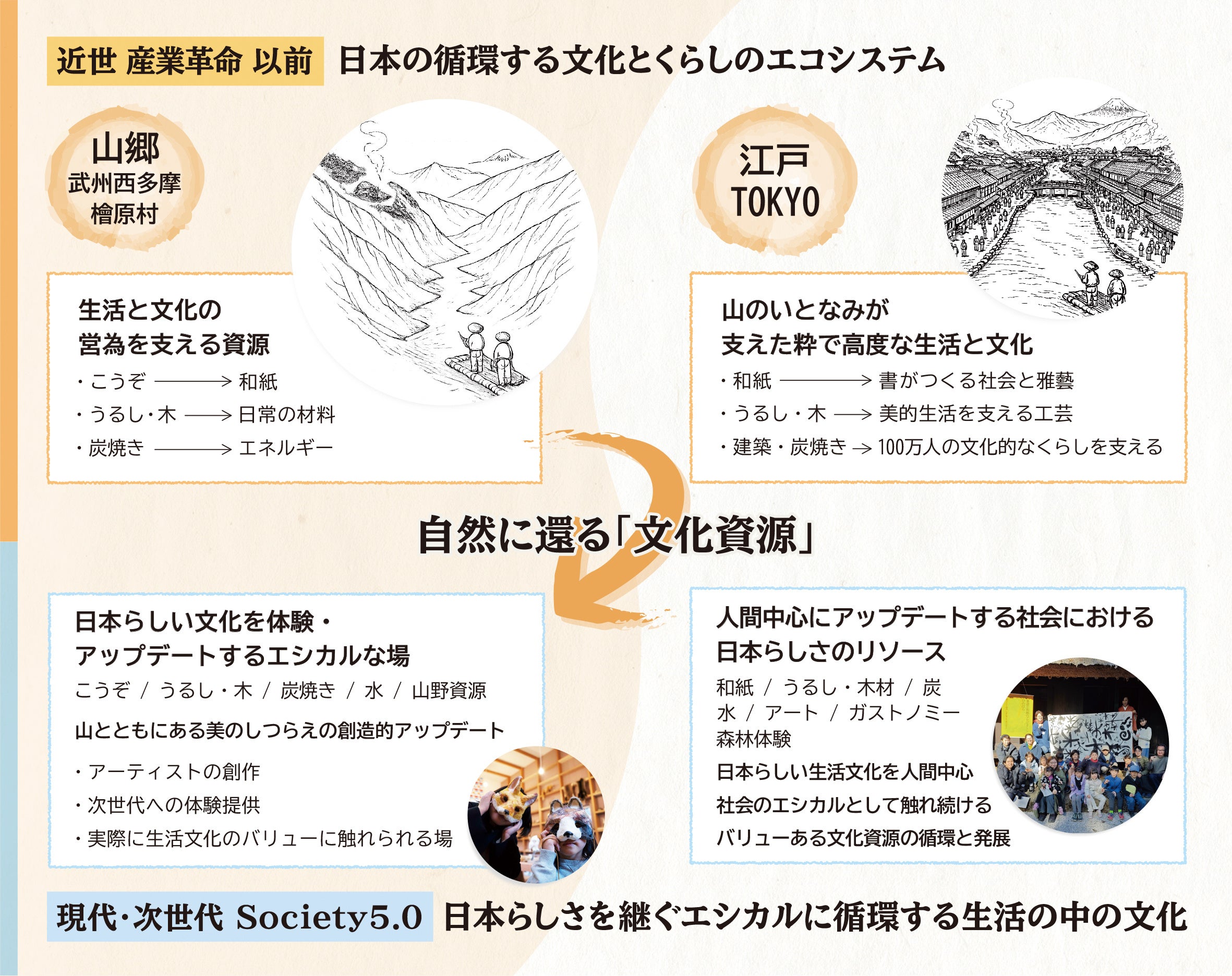 デジタル化が進み、「書く」という行為そのものが日常から減りつつある現代において書が担ってきた生活の美や身体性、思想としての価値を改めて問い直し、日本文化としての「書」を未来へとつなぐ新たな形を探りました。その方法として、江戸・東京と武州の山々を循環して成立してきた書・紙・人のエコシステムに着想し、その循環が今なお息づく東京都檜原村を舞台に、書を中心に「総体の美」を伝統から創造する書家の川邉りえこがクリエイティブディレクターとなり、生活の中での日本文化のトレンドリーダーであった文人の存在を今によみがえらせ結成した「現代文人五人」の書と和紙の創作を中心に、専門家・芸術家・工芸家・地域住民・次世代を担う子どもたちが共創する実践的な取り組みを展開しました。