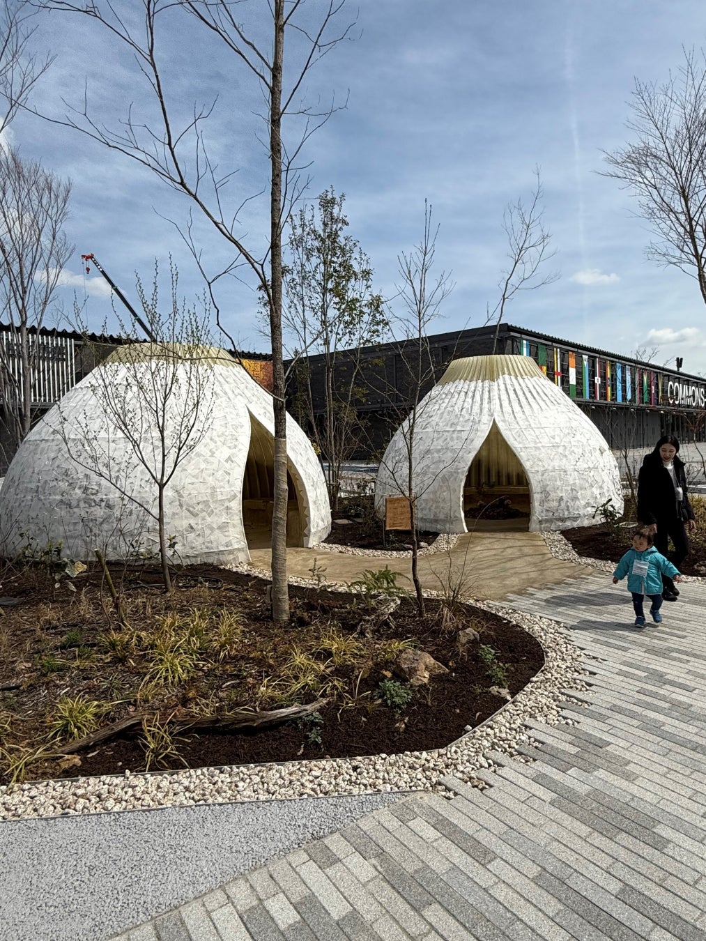 本建築物は、最先端の3Dプリント技術と手づくりの技を融合させた、環境に配慮した新しい建築の形を提案するものです。直径4.65m、高さ2.95mの建築物2棟で構成され、会期中(2025年4月13日から10月13日まで)は来場者の休憩施設として活用されます。