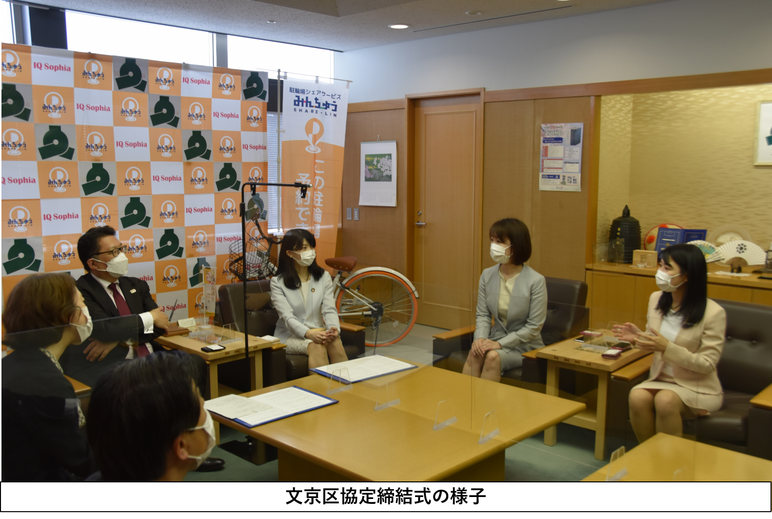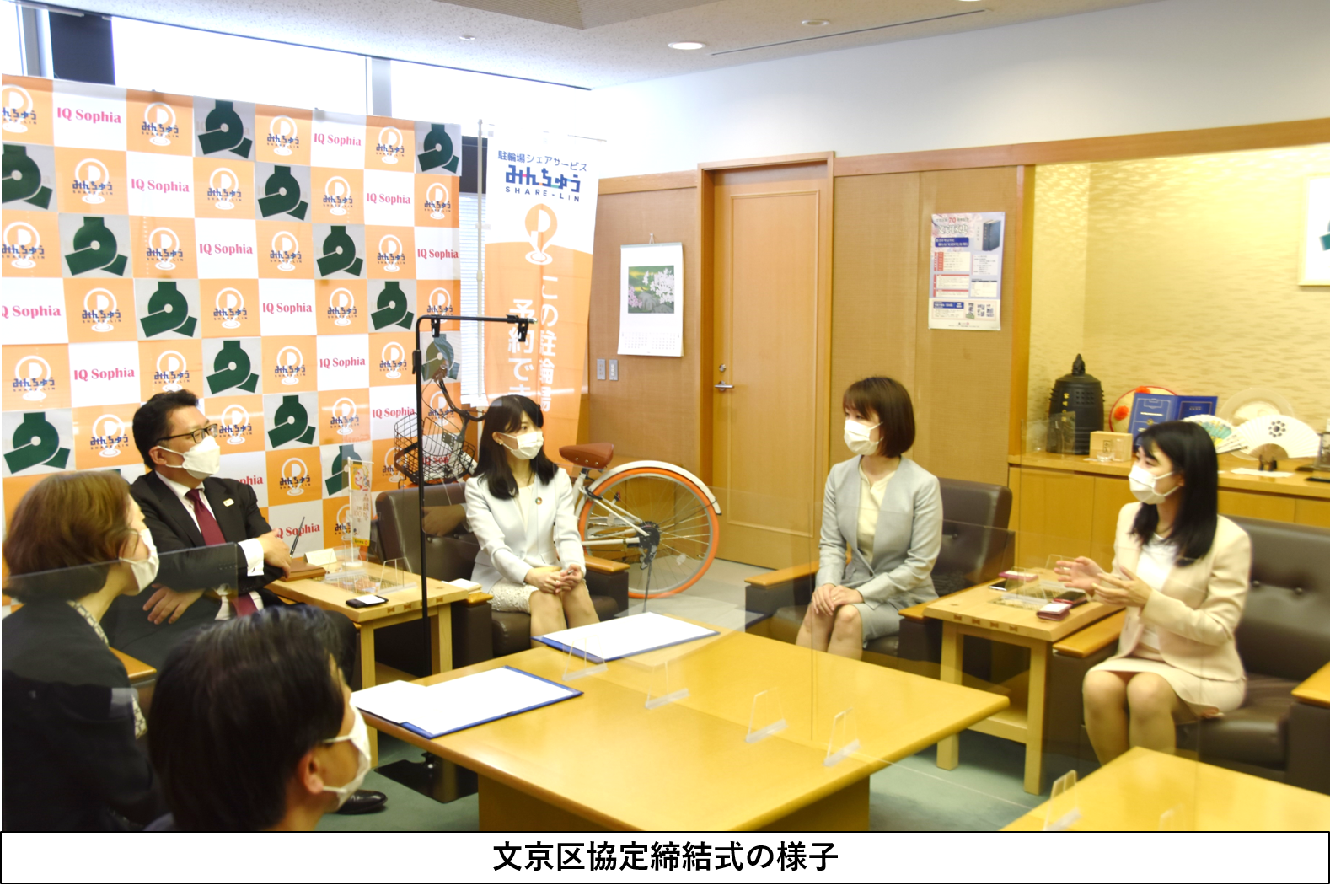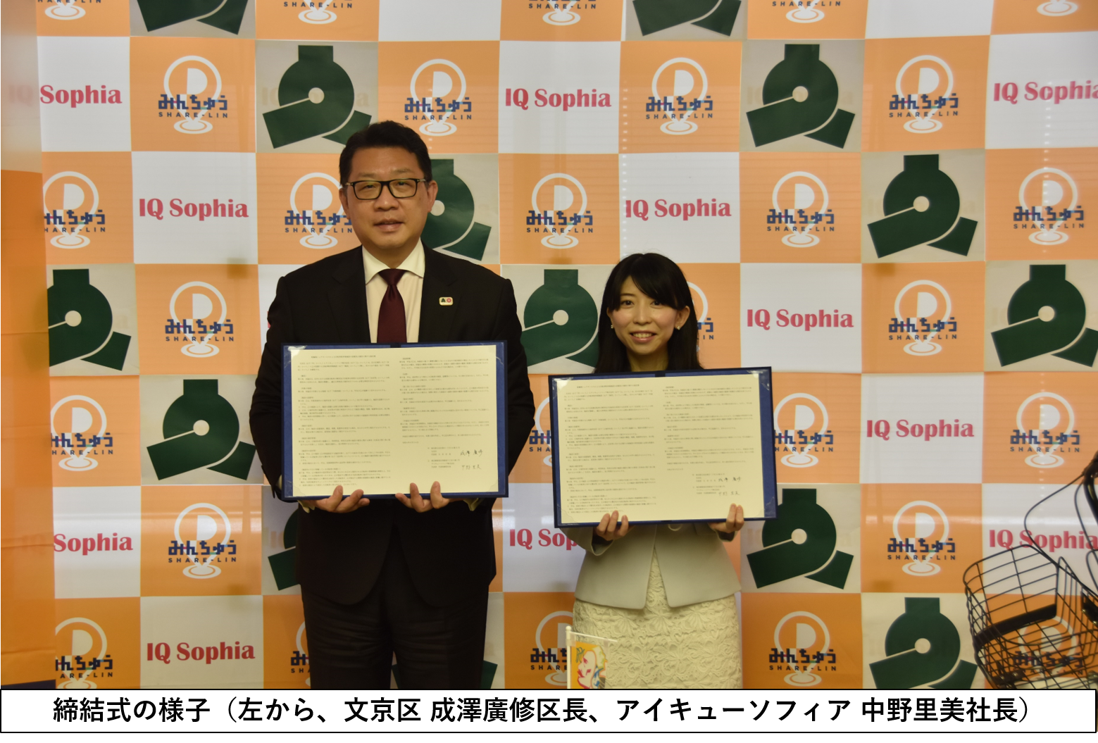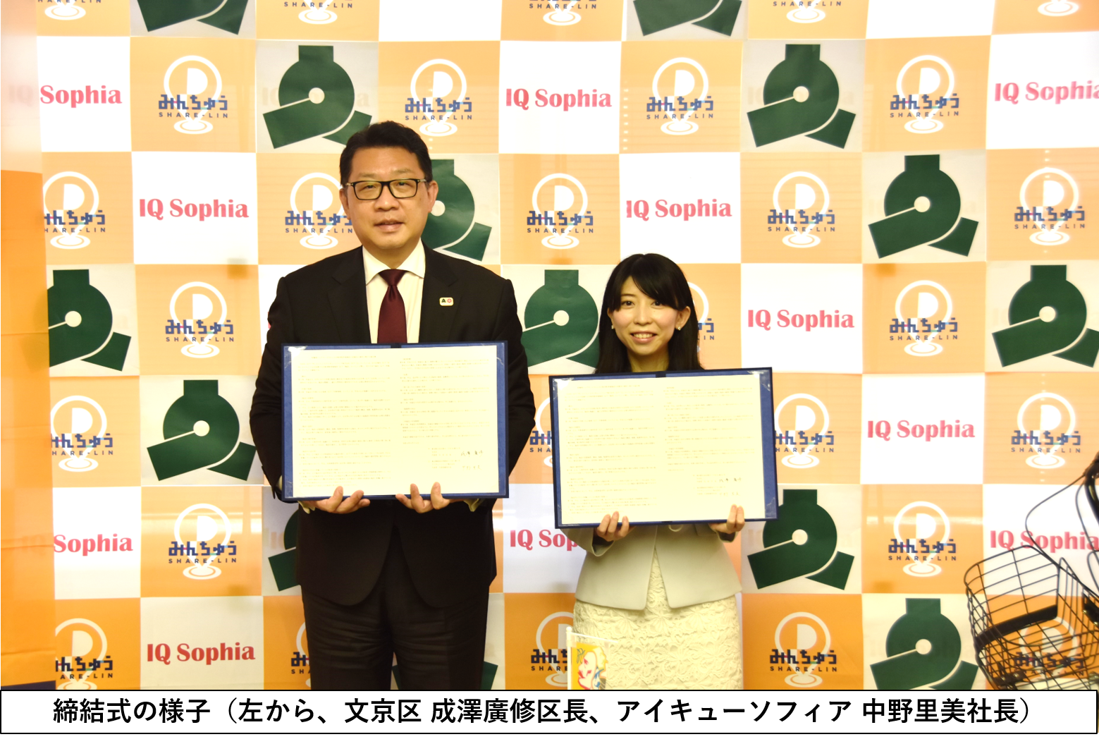 アイキューソフィア株式会社 (本社:東京都新宿区、代表取締役社長:中野 里美、以下 当社) は、2022年4月26日、当社が提供する、スマートフォン等を利用して、空いている土地・スペースを誰でも貸し借りできる駐輪場シェアサービス「みんちゅうSHARE-LIN」の運用を、東京都文京区 (区長:成澤 廣修、以下文京区) と連携して開始する協定を締結しました。今回の協定の締結によって、2022年4月26日より、文京区内(以下実施区)にて、「みんちゅうSHARE-LIN」による駐輪場を開設し、小規模分散型駐輪場を拡充することにより、自転車活用をより便利で安全なものにしてまいります。