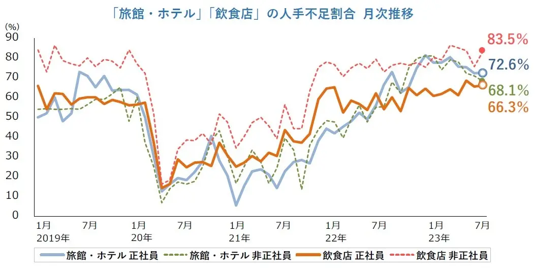 一方で帝国データバンクの調査では、ホテル宿泊業界、飲食業界共に人手不足が加速しており、その割合は2023年7月時点で正規・非正規人材共に65%を超えております。両業界共に採用が追いつかない状態で需要が大きく回復し、人手不足に歯止めが効かない状況が続いております。