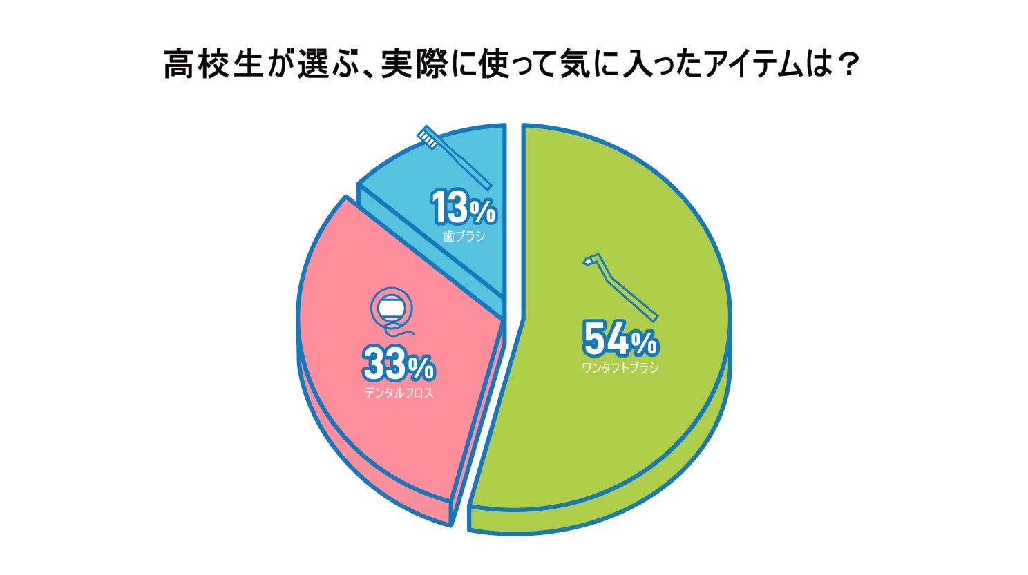 普段の歯磨きで使うアイテムは歯ブラシだけという生徒も多く、デンタルフロスや歯間ブラシを日常的に使用しているという回答は2割ほど。そんな生徒たちに、実際に使って気に入ったアイテムを聞いてみると以下のような結果となりました。