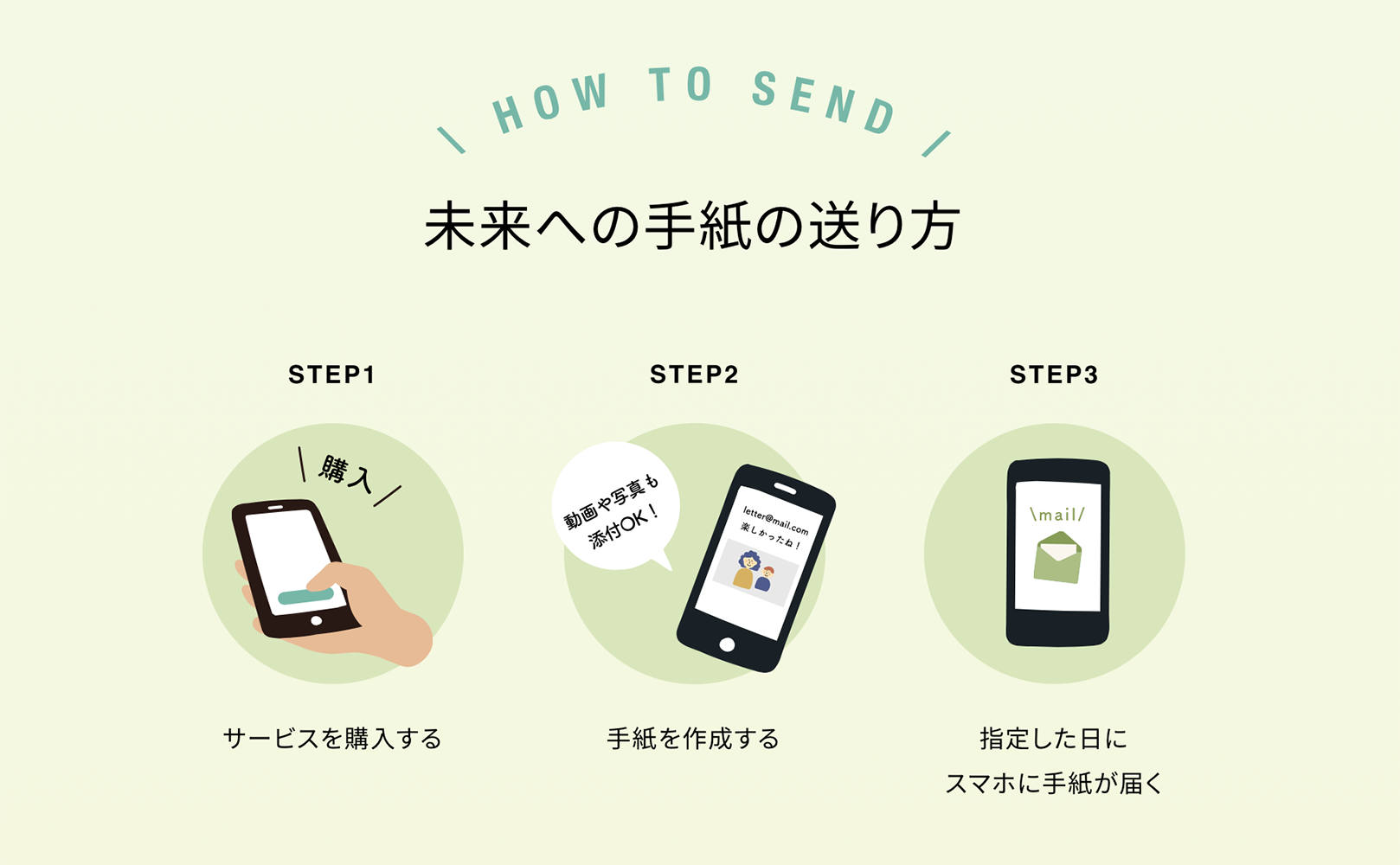 利用者はあらかじめJTBのシステムからサービスを購入し、各自治体に滞在している間に、スマートフォンなどのブラウザを使って、好きな写真や動画にメッセージ添え、メッセージの宛先とメッセージを届けたい未来の日付を指定して送信します。メッセージは指定された日に、自治体ごとに異なるデザインがほどこされたメールで届きます。サービスを導入した各自治体への来訪を促進するため、サービスは海の京都(宮津市、京丹後市、舞鶴市)エリアでのみ利用できるように設計されています。