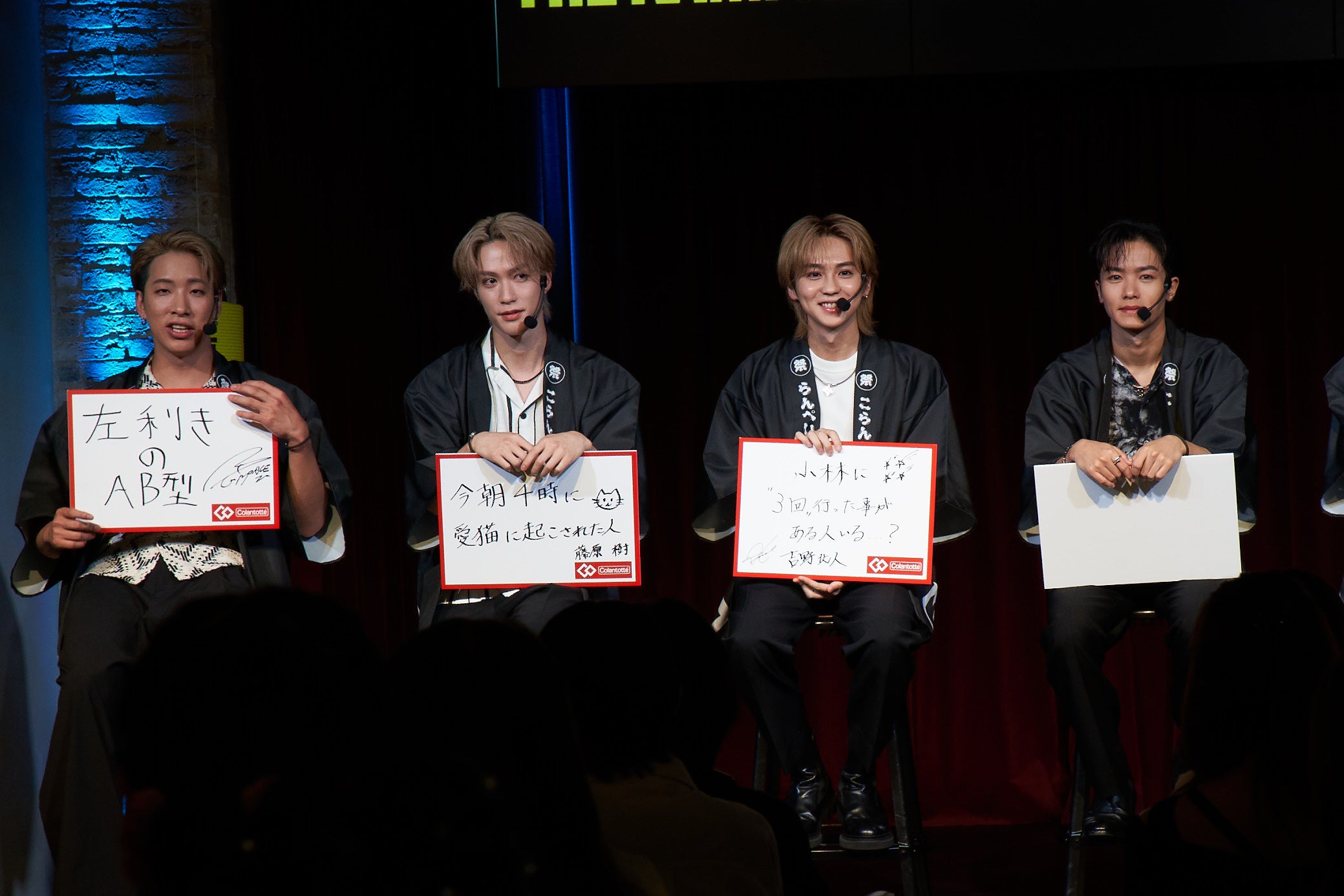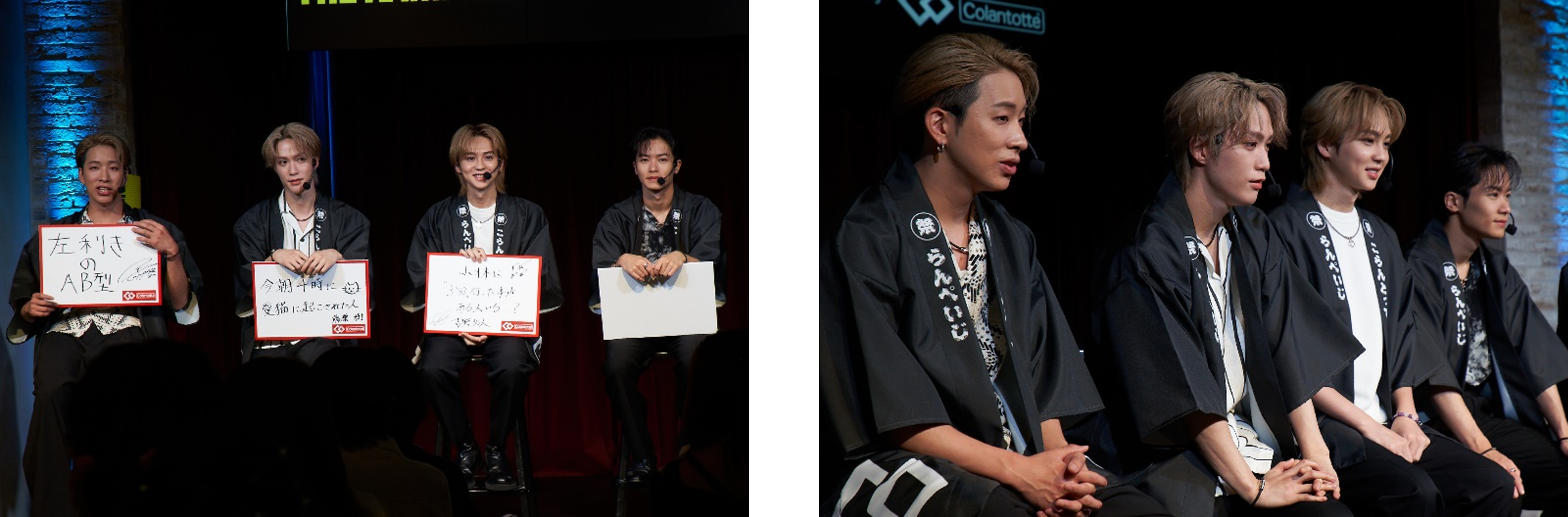 一方、オンライン参加者には、THE RAMPAGEのメンバーに聞きたい質問を募集し、応募が多かった質問に回答しました。「この夏、プライベートで行いたいところは?」という質問については、吉野さんが「行ったことがないから、京都に行きたい」と答え、浦川さんが「昔銀閣寺で寝ていたら、起きたときにはお寺が閉まっていた」と裏話を明かし、会場に笑いが起こりました。また、「女性の浴衣姿で好きな色は?」という質問に、 RIKUさんは、「白ベースに紫のお花柄」という具体的な浴衣姿を回答、「女性のしぐさにキュンとすることは?」という質問に、武知さんは「暑いとハンカチで、顔をあおぐ姿」と回答し、ファンから歓喜の声があがりました。