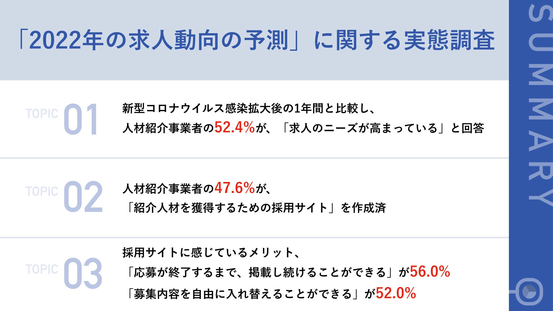 新型コロナウイルスの影響残るも、求人ニーズ復活の兆し 人材紹介事業者の60%以上が「2022年以降、求人ニーズが高まる」と予測 ー「2022年の求人動向の予測」に関する実態調査を実施ー