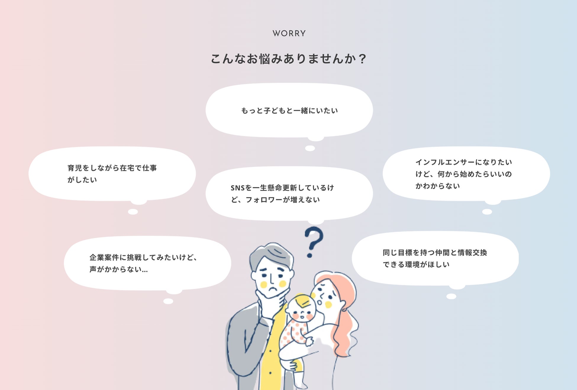育児をしながら新しい働き方にチャレンジしたいママたちに向けて、インフルエンサーとしての実践的なスキル育成と実際の仕事の機会、ママたちのコミュニティーの場を提供してまいります。