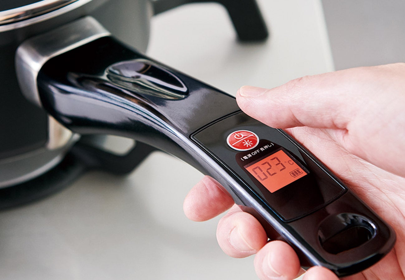 ビタクラフト テンプパンIIは、本体の調理面に内蔵された温度センサーで調理温度を計測、リアルタイムでハンドルの温度モニターに表示します。