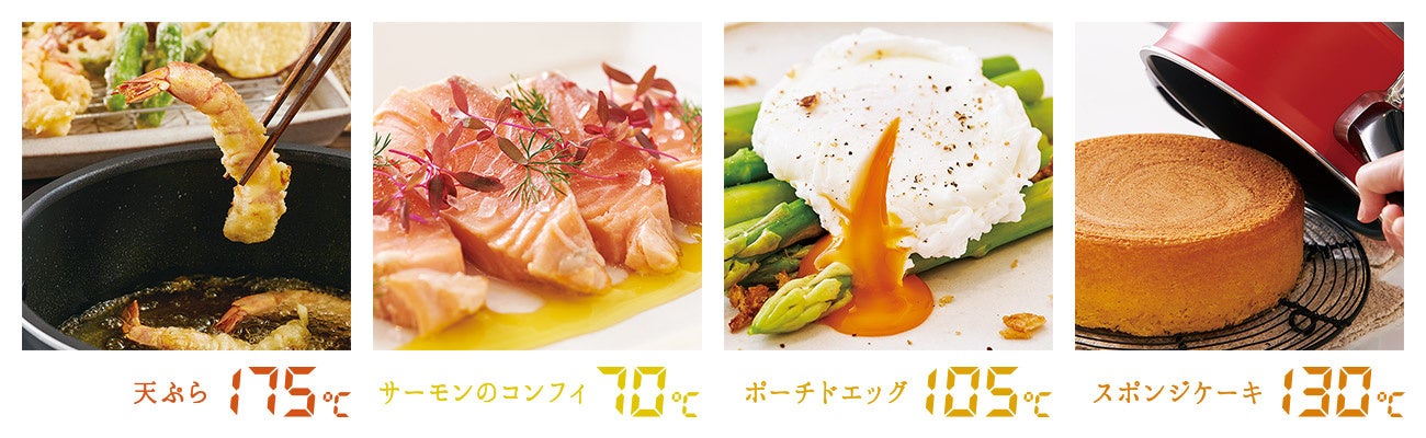 火加減・タイミングなど、作る人の感覚や経験に左右されるあいまいな感覚ではなく、「温度」という絶対的な数値で調理できるので、誰でも簡単にプロ級の美味しさを再現することができます。