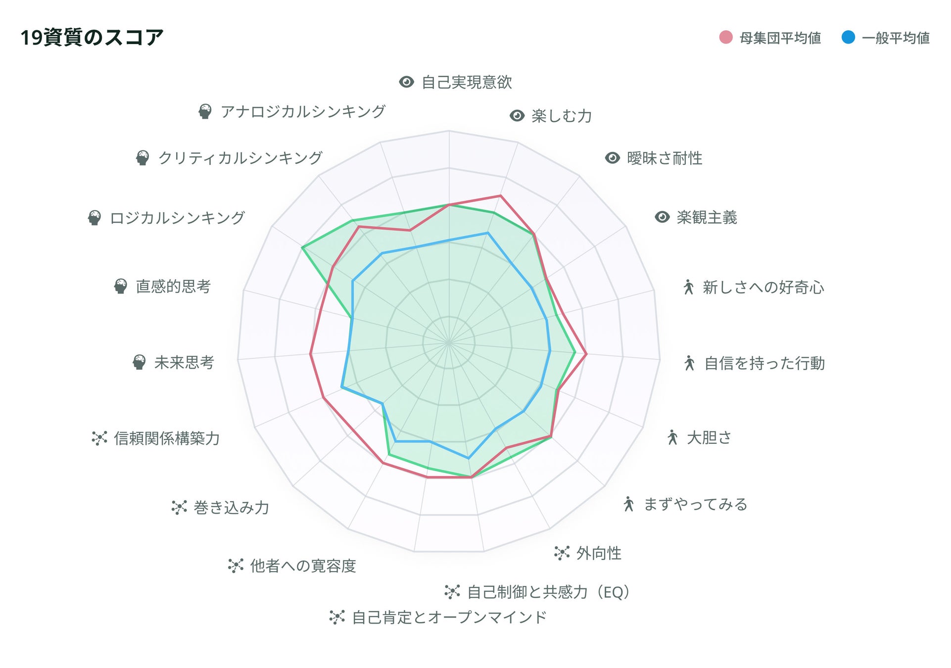 さらに、これら4つの能力のうち、変革人材として特徴的な19の資質を特定。77の質問に回答することで、これらの資質をどれだけ持ち合わせているかを可視化します。人が持っている思考や行動の特性に加え、多くのステークホルダーを巻き込む「関係性構築力」を資質として可視化していることが特徴です。