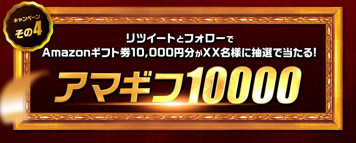 キャンペーン その4「アマギフ10000」:Twitterのフォロー&RTでAmazonギフト券10,000円分をRT総数に応じてXX名様にプレゼント!