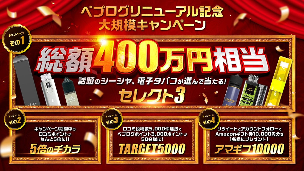 国内最大級の電子タバコ総合口コミサイト「ベプログ」がリニューアル!現在総額400万円相当のキャンペーンを開催中!