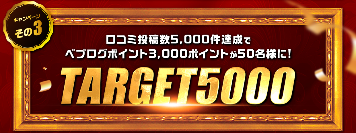 キャンペーン その3「TARGET5000」:期間中の口コミ投稿総数が5,000件達成で、3,000ポイントを50名様にプレゼント!
