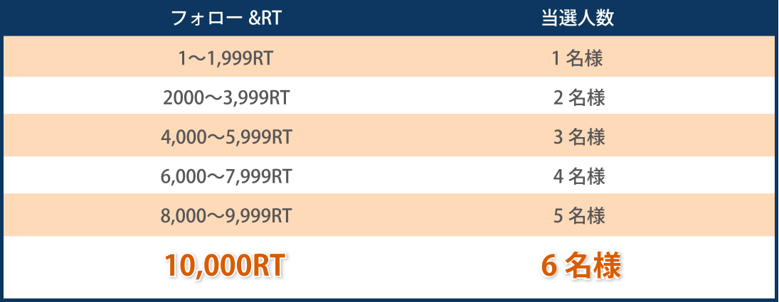 ・当選者数:2,000RTごとに当選者数が1名様追加 ※例:10,000RTの場合、6名様に当たります。