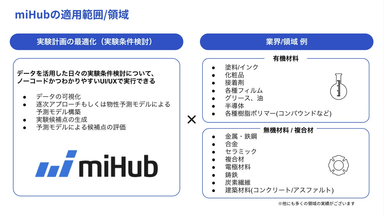 「miHub」は、データ解析とノウハウの蓄積を通じて、データ駆動型研究開発を実現するマテリアルズ・インフォマティクス(MI)プラットフォームです。本プロダクトは、研究者自身がノーコードでMIを活用し、物性予測や最適な材料合成条件を迅速に特定できます。さらに2024年1月の全面刷新を通じて、属人化されがちな実験や解析のノウハウを組織全体で活用できるようになりました。