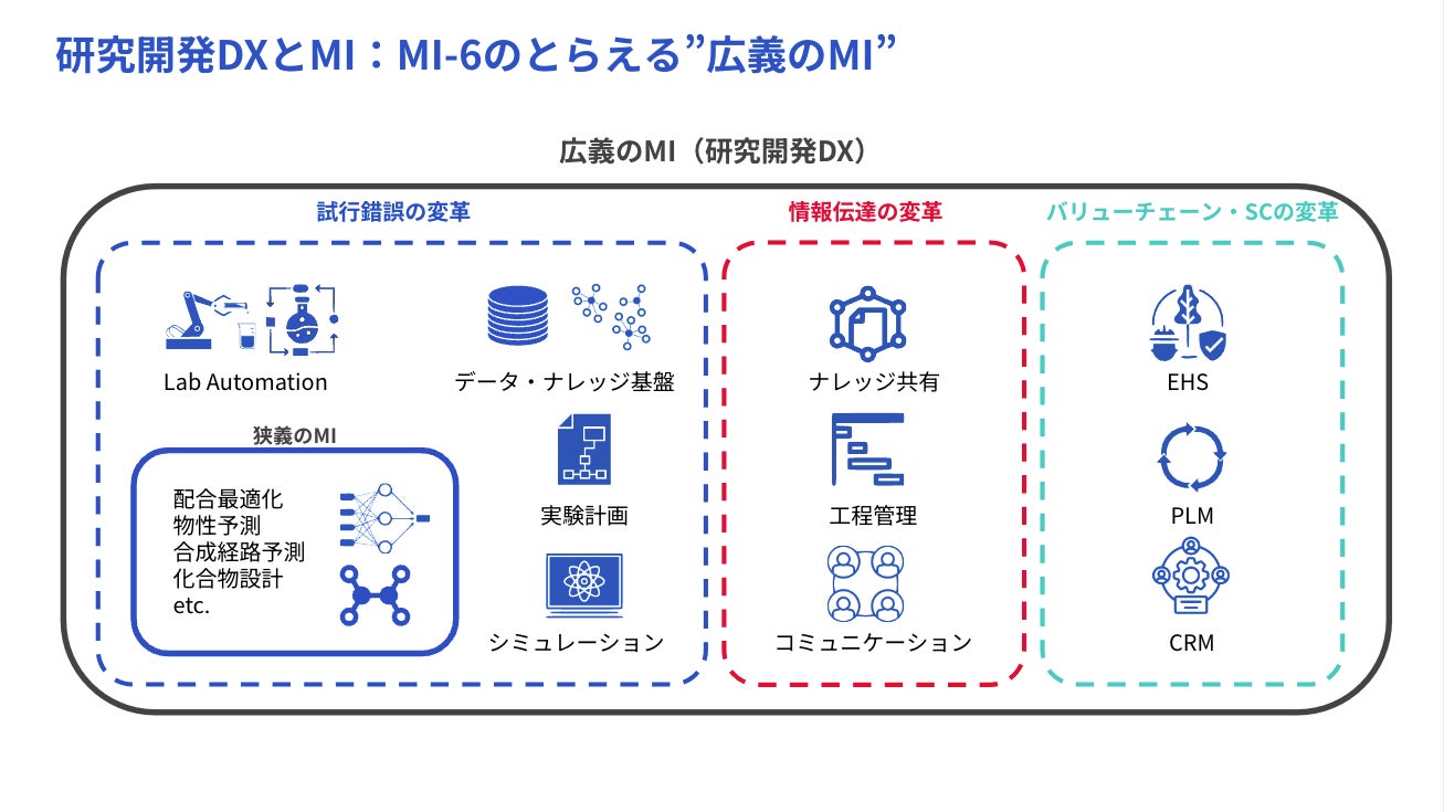 miHubでは、本質的な研究開発業務のDXを実現するため「広義のMI」に取り組むためのソリューションを提供しています