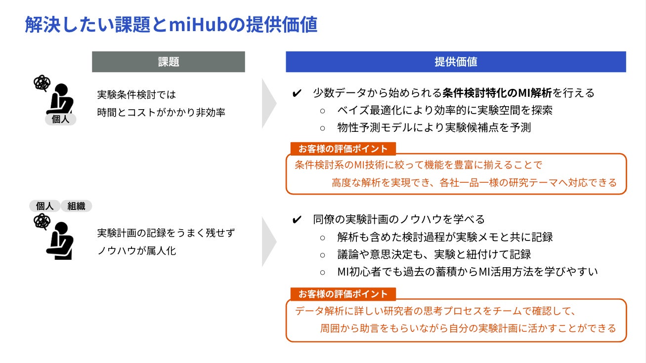 「miHub」導入の決め手となった理由について、多くの方々から「実際の材料開発経験・MI推進経験が活かされた設計になっており、当社でも使っていけるイメージが湧いたから」というご意見を頂戴しています。