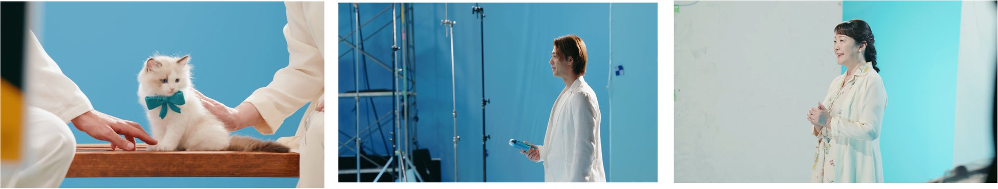 撮影はお二人とも自然体で臨んでいただけたため、とても和やかな雰囲気でスムーズに行われました。 CMでは初共演となるお二人は、撮影の合間で薬用 ビューネの形をした島に置いたベンチに腰掛け、お話しされていて、時にはビューにゃんと戯れている様子が印象的でした。
