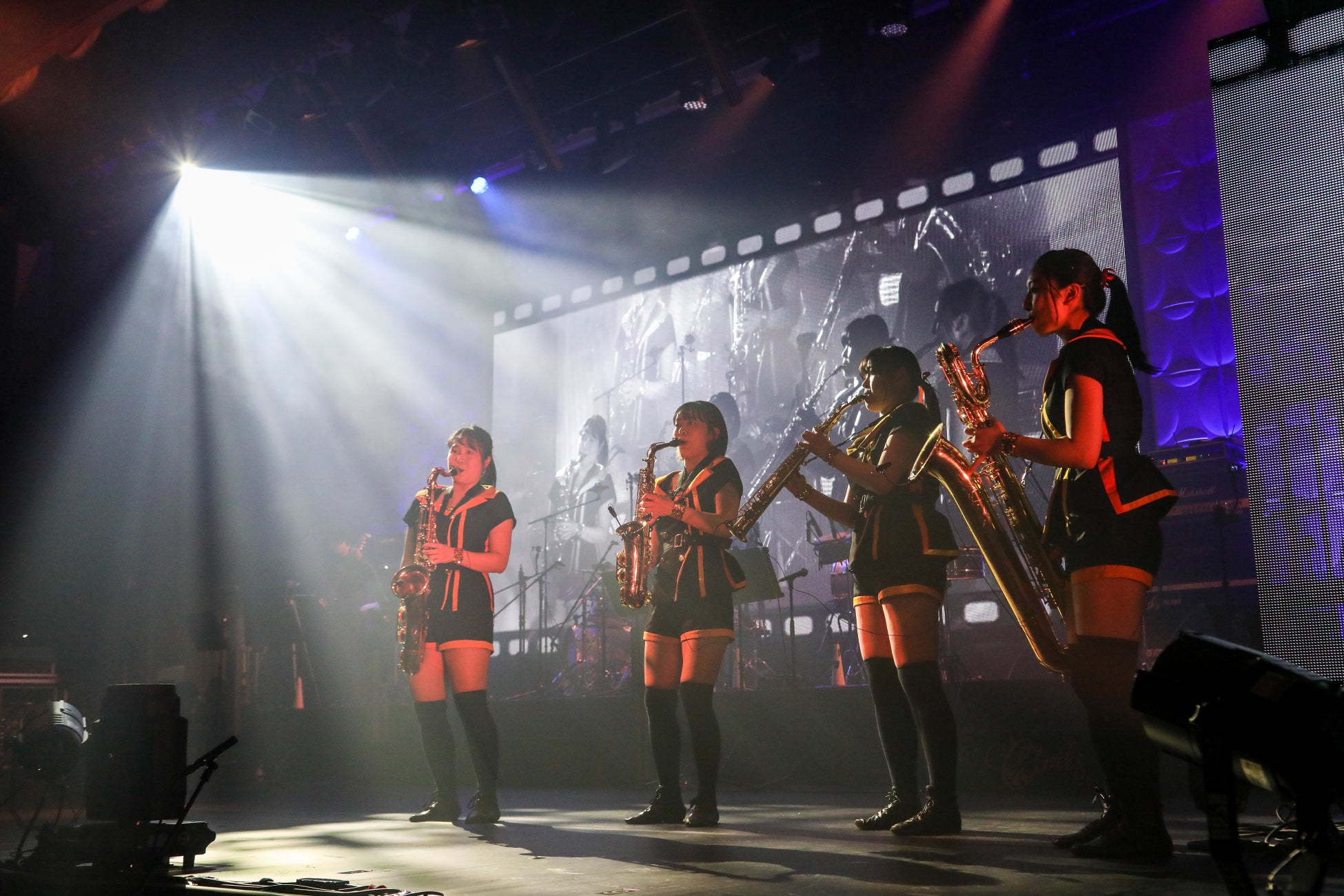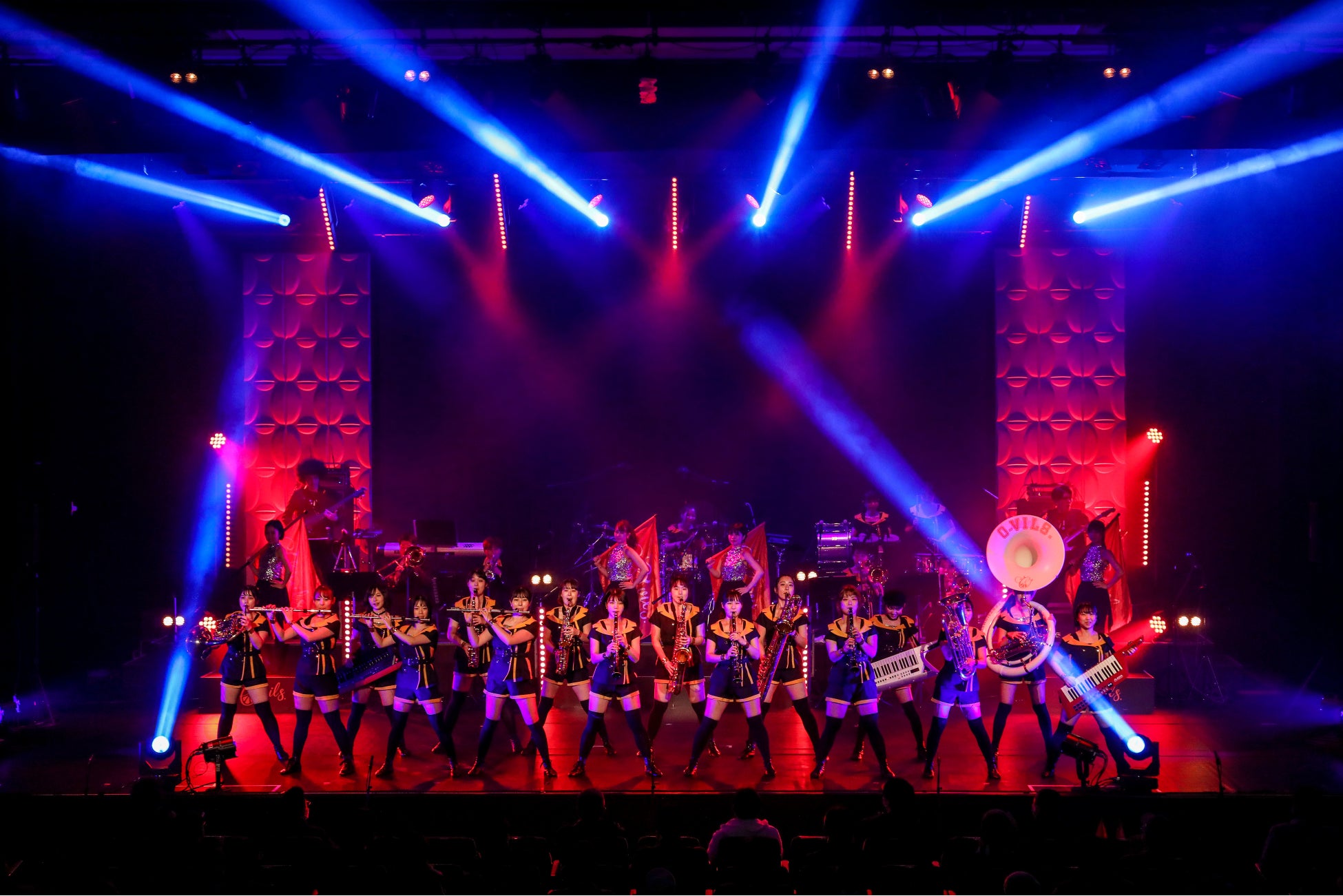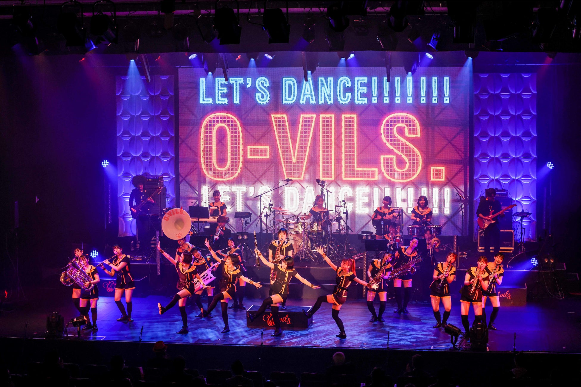 また、フルートのソロが一際美しく響き渡る『Amazing grace』では場内に澄んだ空気が満ちてゆき、観客も大きな拍手を送る。その後、『Get a way』でファンキーな熱を帯びて、『Sing Sing Sing』では再びステージにメンバー全員が勢揃い。ステージ前方で横位一列に並んで楽器を演奏しつつ後ろ向きでヒップを揺らしたり、リズミカルに足を動かしたりと、フォーメーションを変化させながら演奏。可愛くセクシーに魅せるO-VILS.ならではの圧巻のダンスパフォーマンスに観客も拍手喝采で本編を終える。