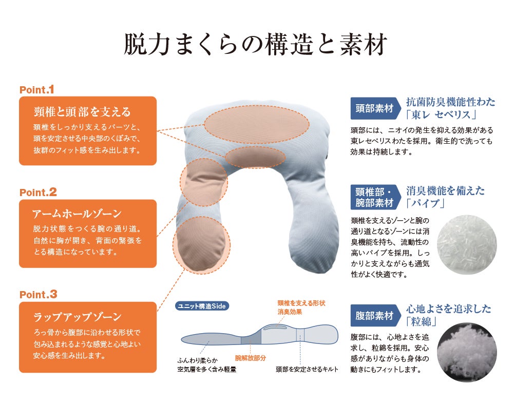 頭部部分は皮脂や汗などによるニオイの原因となる細菌の繁殖を防ぎ、ニオイの発生を抑える効果がある「東レ セベリス」を使用しています。またアームホールドゾーンには、防臭機能もつ「パイプ」を使用することで、流動性を高め、性別や体型を問わず様々な人の腕と脇をしっかりと支えられます。ラップアップゾーンには、心地よさを追求し、通常の綿よりも反発力の低い「粒綿」を使用し、体の動きにもフィットします。