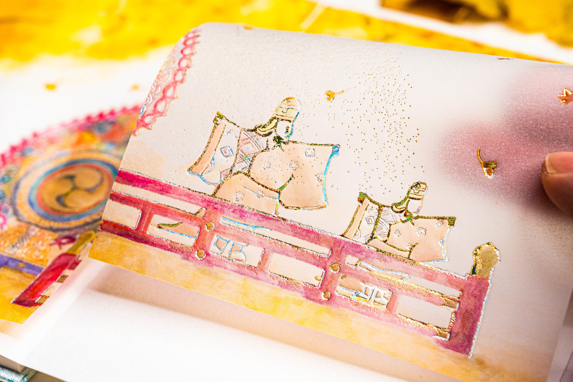 帳面の上に貼られた「透かし紙」には、秋の実りに感謝をして舞楽を捧げる様子を水彩で描き、キラキラ光る極細の金銀箔をあしらって麗らかな秋の光を表現しています。