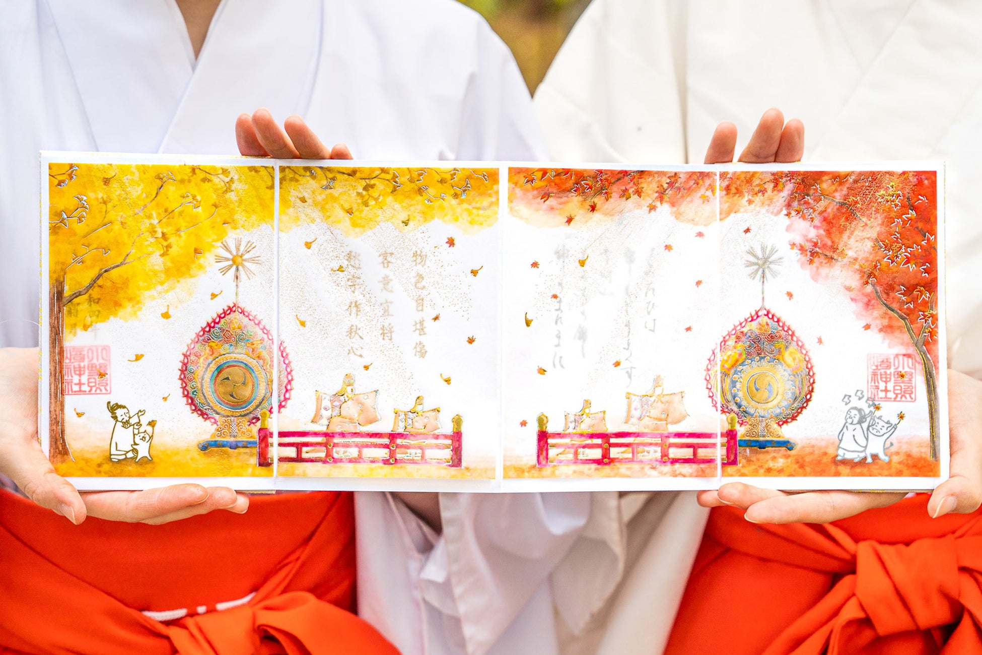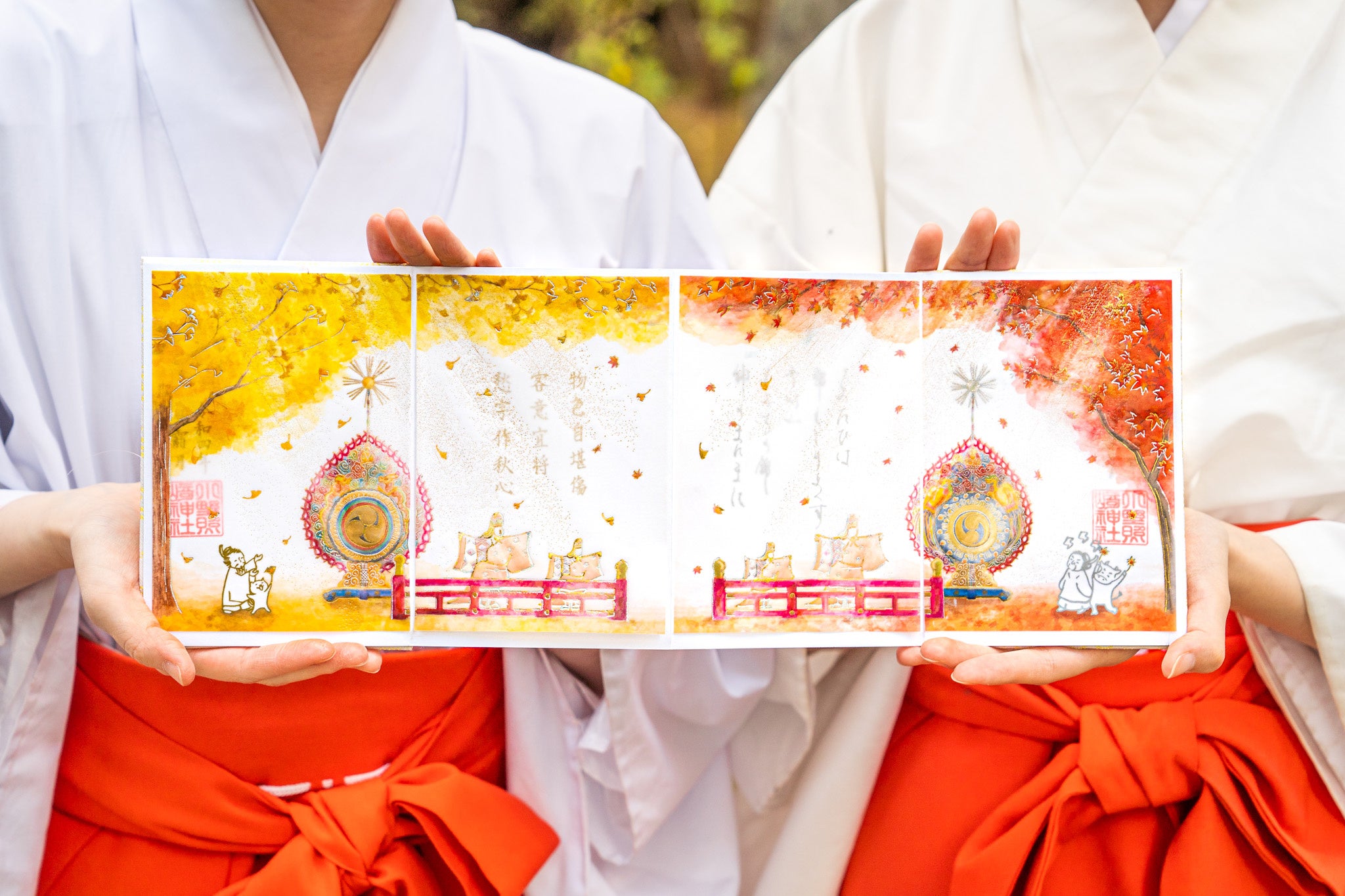 4面ひと繋ぎの二層式御朱印、紅葉の大パノラマに秋興の詩を重ね、秋の実りを寿ぐ