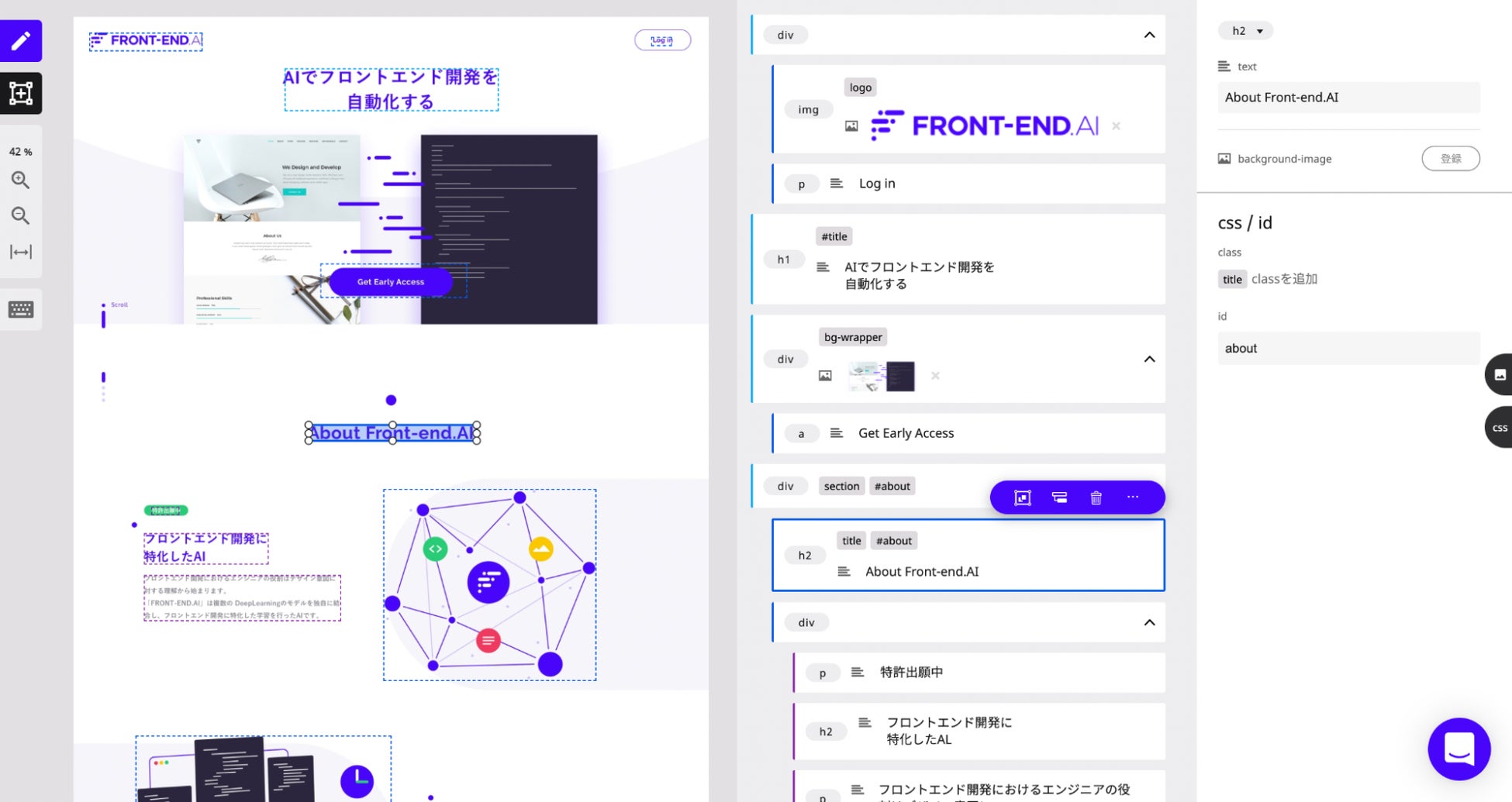 FRONT-END.AI ( https://front-end.ai/ )は、フロントエンド開発における初期工程を AI によって自動化するWebエンジニア向けローコードサービスです。