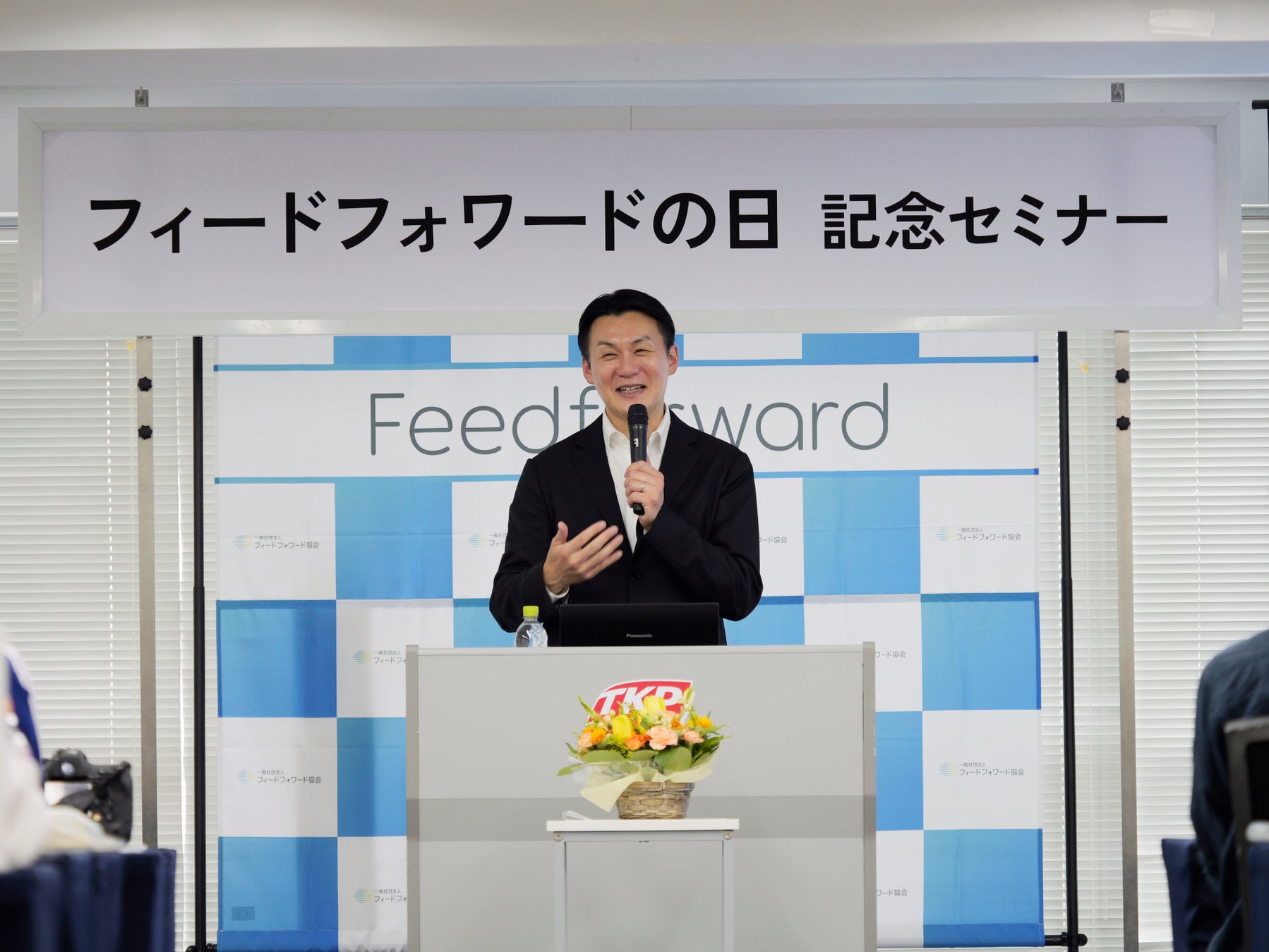 セレモニーでは、フィードフォワード開発者でフィードフォワード協会の代表理事である久野和禎が登壇し、フィードフォワードは「未来思考の考え方と技術」であることや、そのシンプルさについて改めて説明しました。
