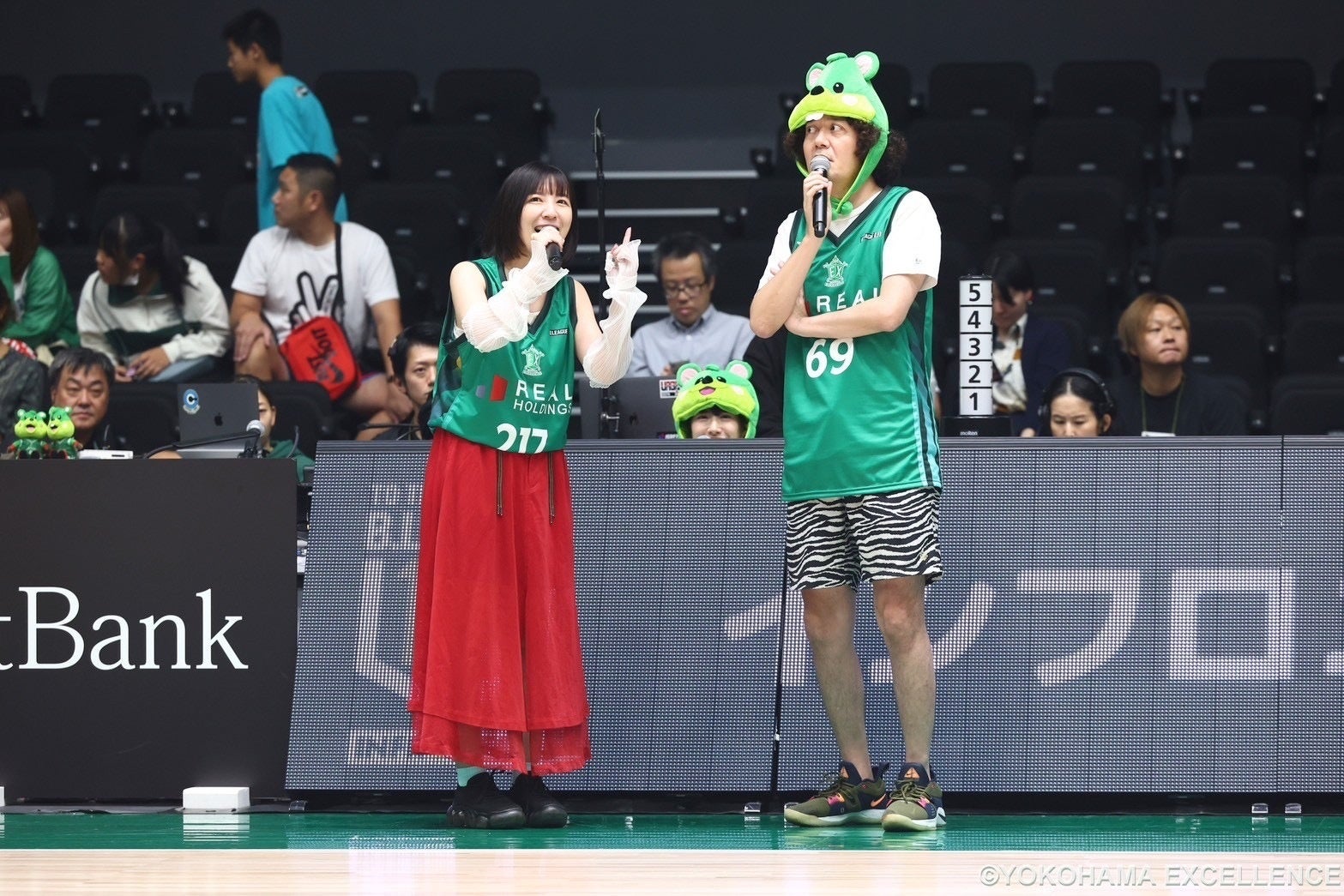 来場者へのハリセン配布などのプレゼントや、横浜キヤノンイーグルスのカノンちゃん・横浜エクセレンスも出演している「We Are EXCELLENCE!」のDJを務める平沢あくび氏などが応援へ駆けつけ、試合の合間にはモノマネショーが開催されるなどホーム開幕戦を華やかに彩る中での試合は、100点ゲームとなる103得点、そして失点も2試合連続60点以下となる59に抑えて勝利!