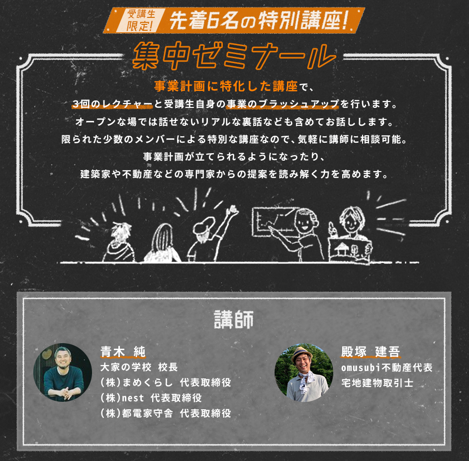 9期からは新たに、3回のレクチャーと受講生自身の事業のブラッシュアップを行う、先着6名の特別講座をスタートします。講師は、大家の学校 校長の青木純に加え、空き家活用の企画・運営やDIY可能賃貸を取り扱うomusubi不動産 代表の殿塚建吾氏。オープンな場では話せないリアルな裏話なども含めてお話しします。限られた少数のメンバーによる特別な講座なので、気軽に講師への相談も可能です。事業計画が立てられるようになったり、建築家や不動産などの専門家からの提案を読み解く力を高めます。