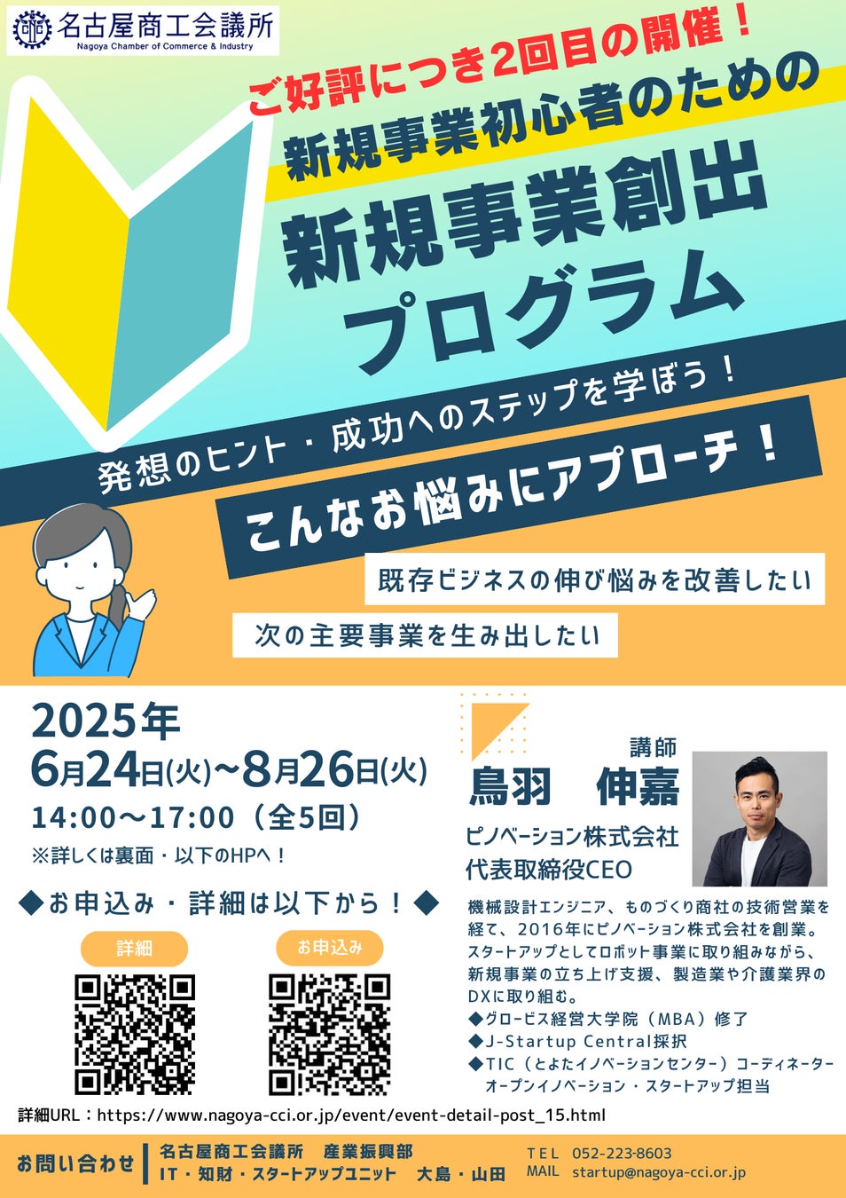 名古屋商工会議所は、受講者全員が「他の人にも勧めたい」と評価した「新規事業創出プログラム」の第2弾を開催いたします。今回も、J-Startup CENTRAL選定企業であり、製造業向けの協働ロボットソリューションなどを展開する「ピノベーション株式会社」と連携し、スタートアップの実践的なワークショップ形式で、事業アイデアの創出からビジネスモデル構築、発表までを伴走しながらサポートします。