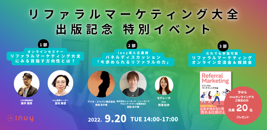 株式会社クリエイティブホープ(本社:東京都新宿区、代表取締役社長 香取 宜伸)が運営する「リファラルマーケティングクラウド invy(インビー)」 (以下 「invy」)は、最新のリファラル/リファーラルマーケティング事情から、具体的な改善アドバイスまでを集約した邦書としては日本初(自社調べ)となる書籍を発売いたします。