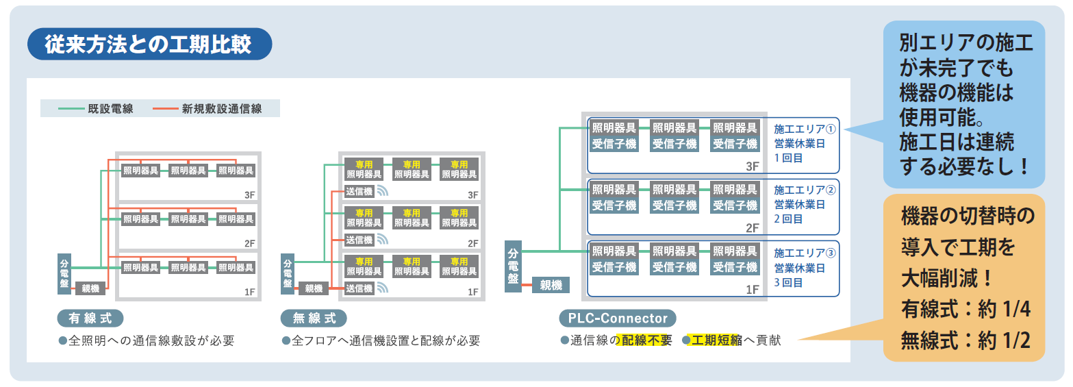 今回発売する「PLC-Connector」は、建物内の既設電力線へ接続することで、多くの機器を自動制御できるシステムで、工期が短く、システム導入時の負担を軽減します。フロア別など段階的な導入が可能なため、施設の稼働を止めずに設置することができます。