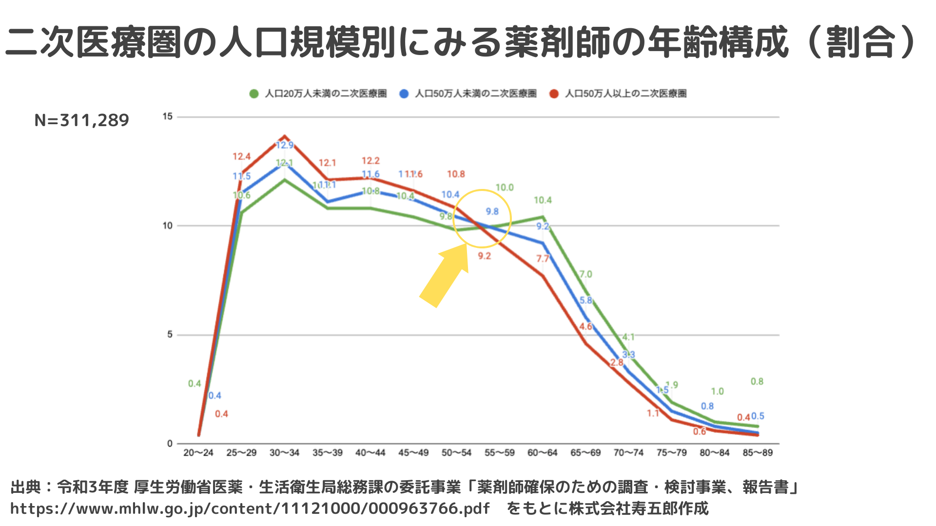 特に、薬剤師においては、厚生労働省発表の令和3年度厚生労働省医薬・生活衛生局総務課委託事業「薬剤師確保のための調査・検討事業、報告書」の結果からも分かるように、都市部と比較して若年層の薬剤師の割合が低くなっています。逆に60~64歳の薬剤師の割合が高く、これは、都市部から離れるほど若い人材が減少していることを意味しています。特に20万人以下の二次医療圏では、高齢化や人口の減少に伴う医療需要の増加に対して、薬剤師の数が足りておらず、慢性的な人材不足が深刻な課題となっています。
