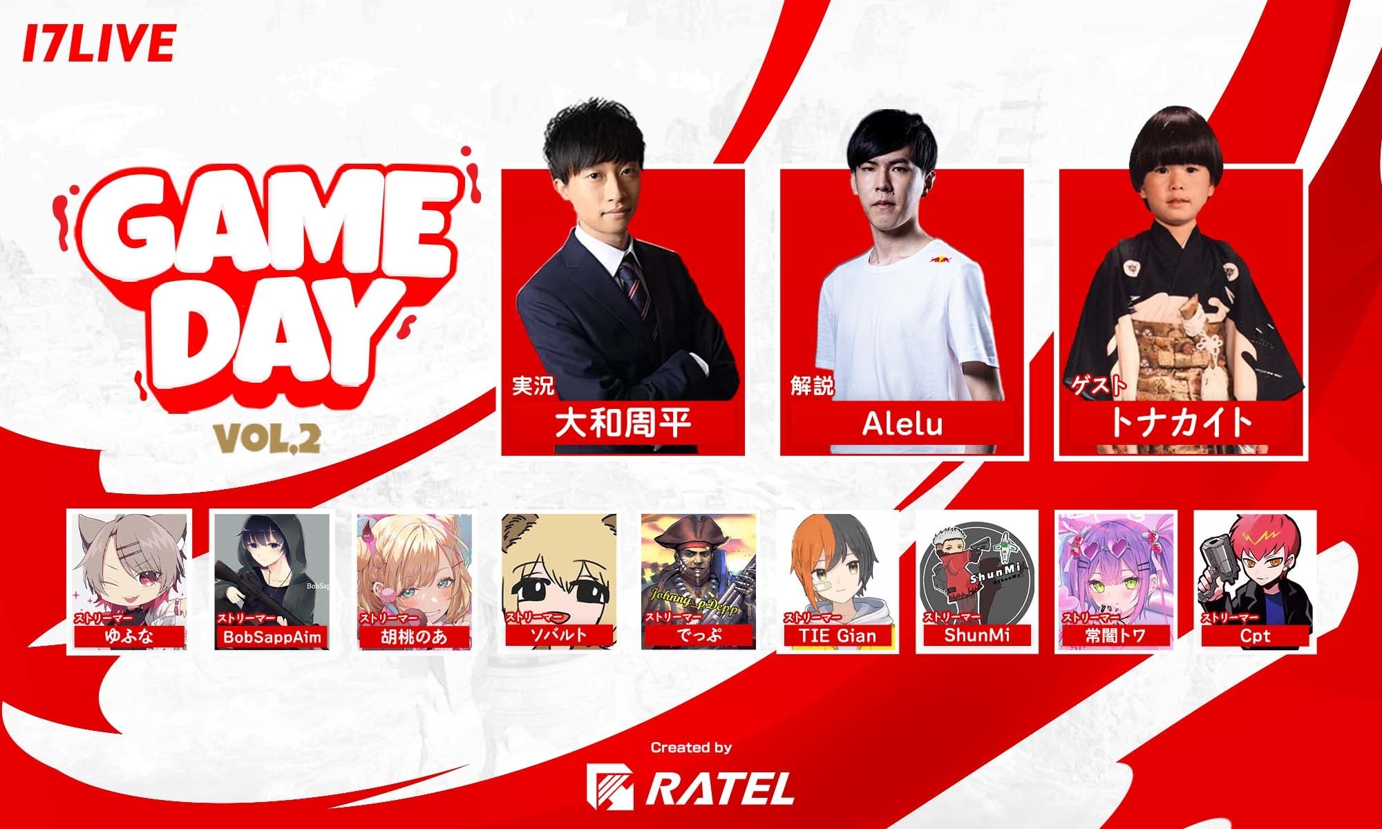 17LIVE株式会社(https://jp.17.live/)が主催する「Apex Legends」の大会「17LIVE GAME DAY vol.2 〜Apex Legends〜」(読み : ワンセブンライブ ゲームデイ)を、株式会社RATEL(https://ratel.games/)において制作・運営・放送することが決定いたしました。大会当日にはゆふなさんや胡桃のあさんやBobSappAimさんといった、著名ストリーマーも参加予定となっており、白熱した大会の模様を実況に大和周平さん、解説にAleluさん、ゲストにトナカイトさんをお呼びし、リアルタイムでお届けいたします。