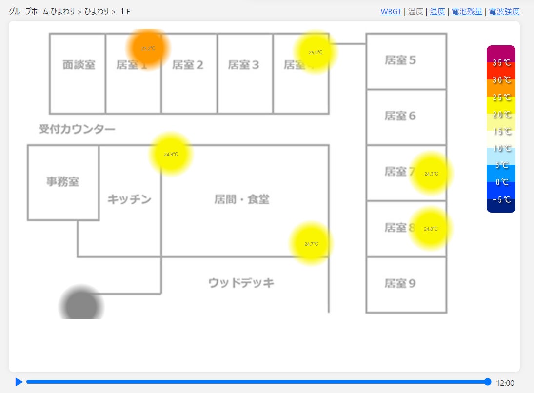 ThingBridge VISIONは自動で温湿度情報を収集しWBGT近似値・温度・湿度の時系列情報を持ったヒートマップとしてレイアウト図に反映されます。また高齢者はウェアラブルバンドを装着することで皮膚温度データを収集することが可能になります。前述の温湿度のデータと皮膚温度の統計データの相関関係などを調査することで施設内においての熱中症リスクなどを判定することが可能になります。