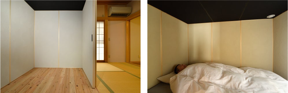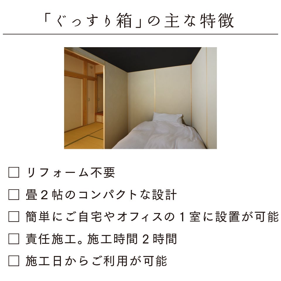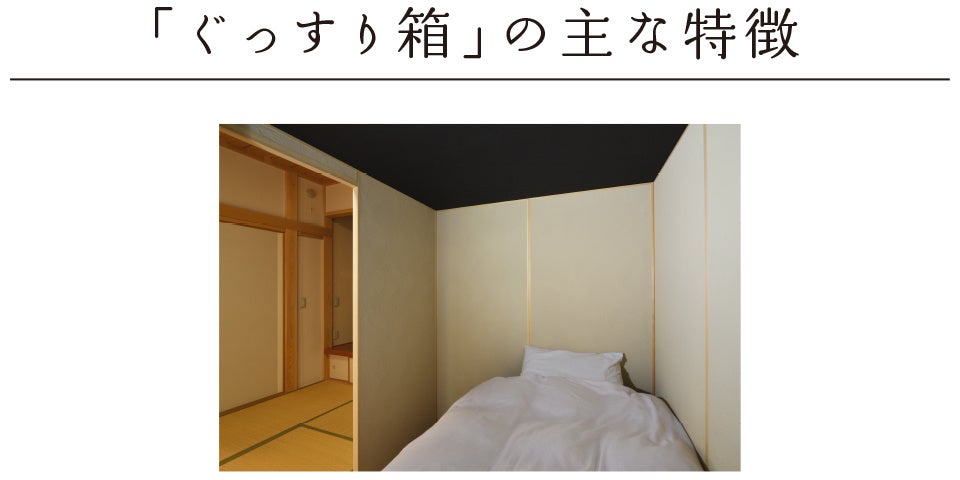 「ぐっすり箱」は、世界6ヵ国で特許を取得した「究極の寝室®」と、日本古来より「間仕切り建具」として発達してきた襖(ふすま)とのコラボにより実現しました。