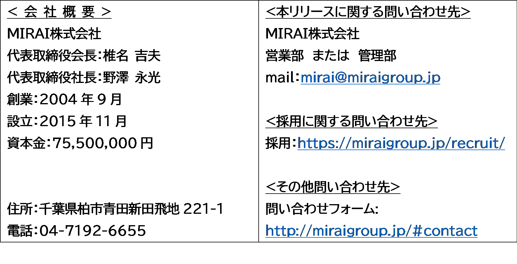 その他問い合わせ:http://miraigroup.jp/#contact