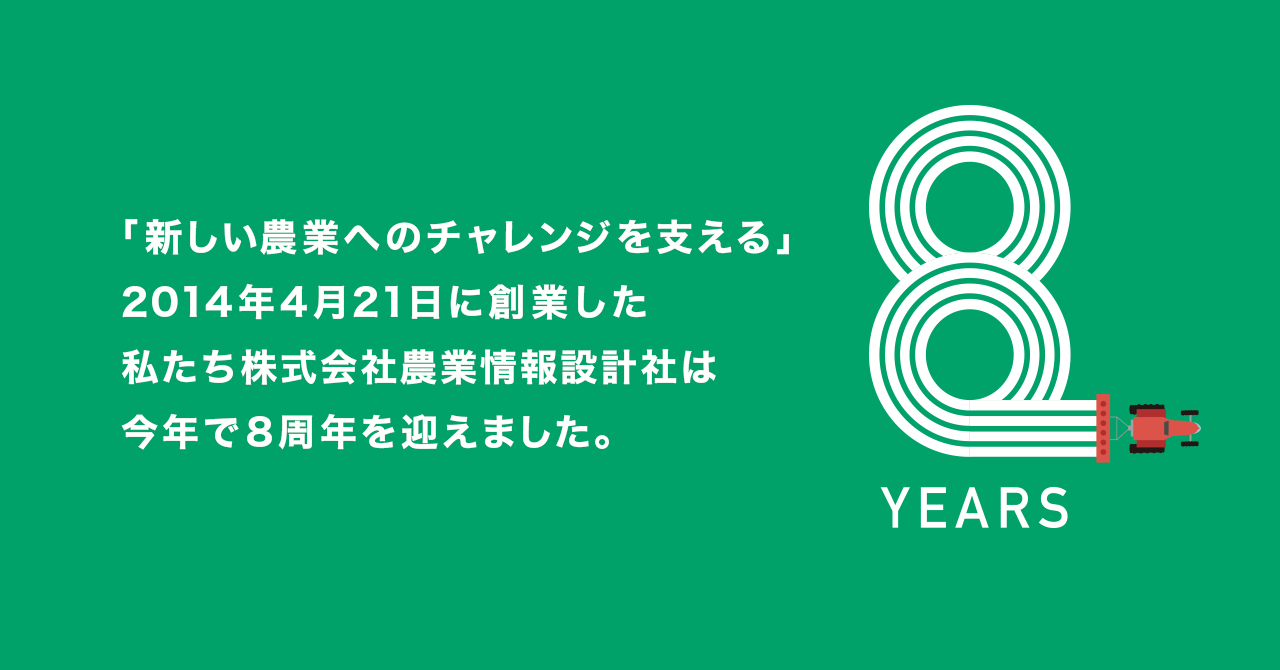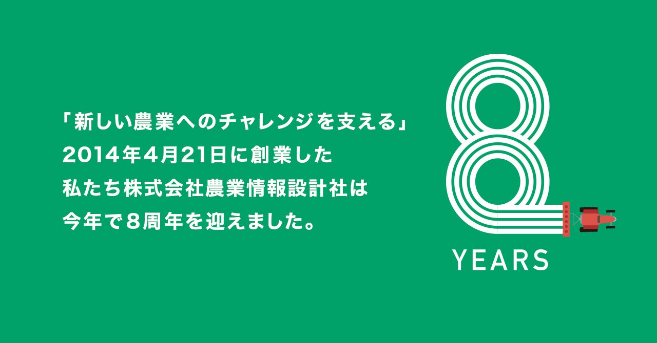 株式会社農業情報設計社(北海道帯広市、代表取締役濱田安之、以下「当社」)は、多くのご利用者様に支えられ、2022年4月21日に創業8周年を迎えました。この8周年を記念し、当社代表より、これまでの取り組みや農業者様の利用状況などをわかりやすく説明した「創業8周年記念サイト」を公開しました。