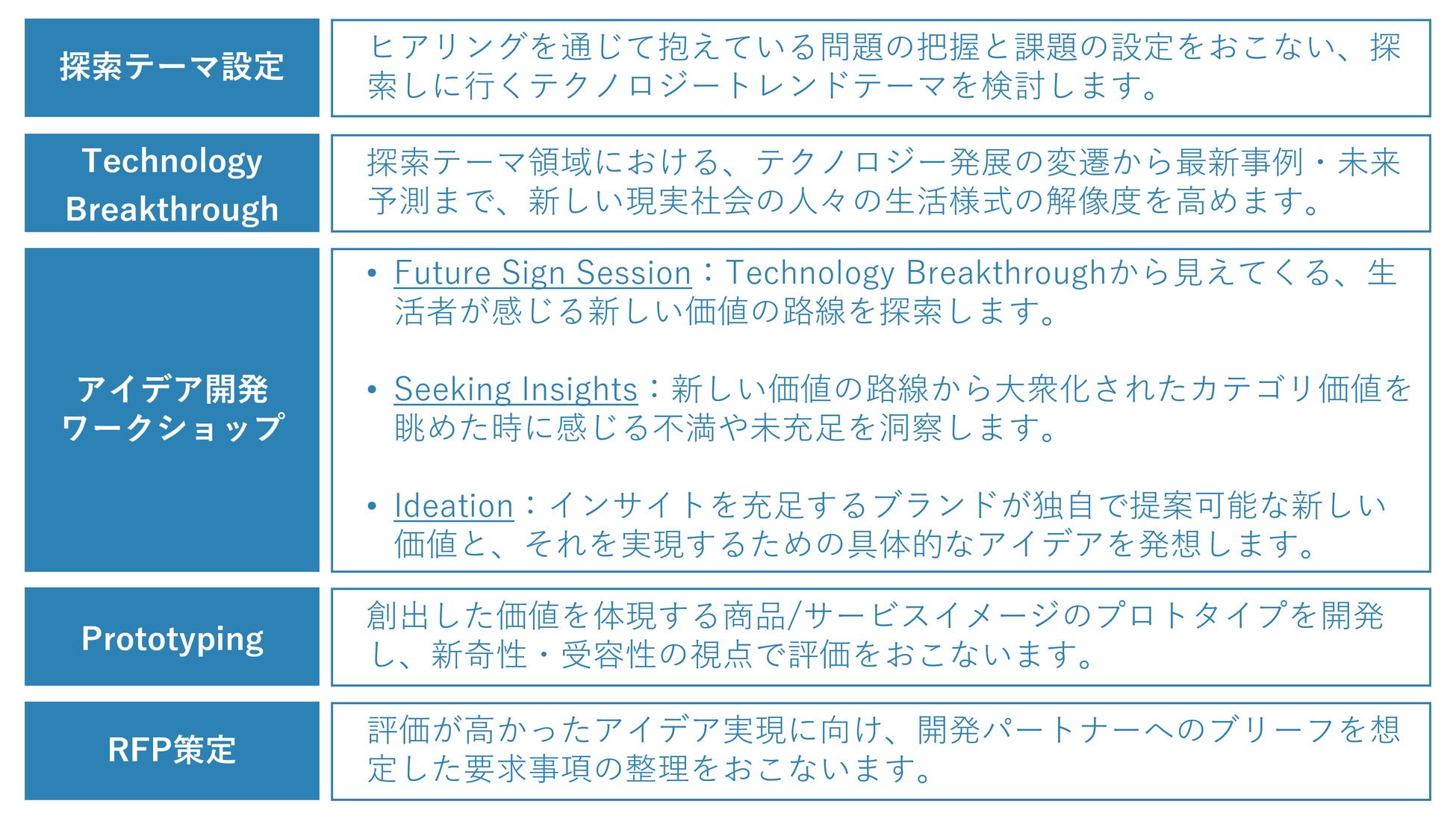 現状把握からテクノロジー探索テーマを設定し、テクノロジーの発展に伴う行動様式の変化、生活者が感じる新たな価値路線を探索しながら、様々な領域で培ってきた実装経験をベースに、実現可能性を踏まえた実効性のあるアイデア開発をおこなっていきます。