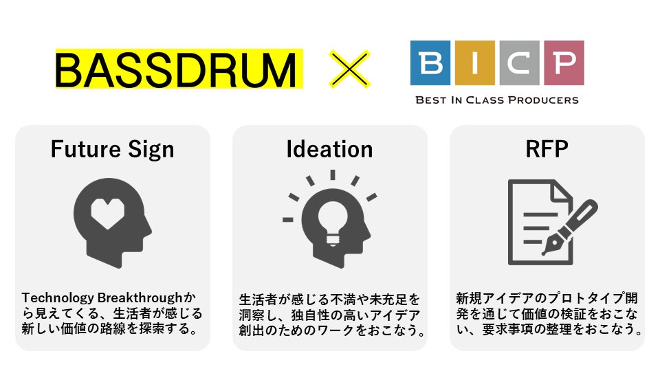 ベースドラム株式会社(本社:東京都港区、代表取締役社長:鍜治屋敷 圭昭、以下 BASSDRUM)は、株式会社ベストインクラスプロデューサーズ(本社:東京都渋谷区、代表取締役社長:菅 恭一、以下 BICP)と協業し、あらゆる産業においてテクノロジーが介入することで変わっていく生活者の価値観や行動様式を捉えながら、新商品・サ―ビス開発のためのアイデア探索プログラム「Technology Sign Ideation Work」の提供を開始します。
