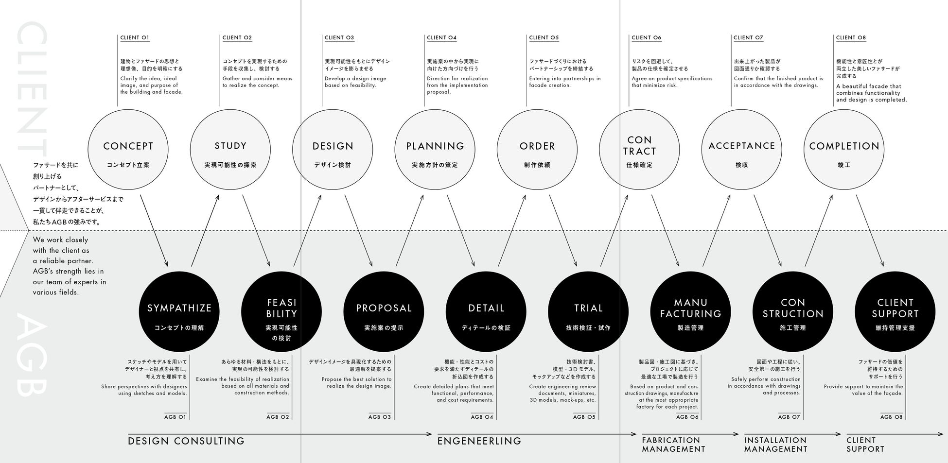 AGBは「後世に受け継がれる美しいファサードづくりで、都市の景観と環境に貢献する」を経営理念とし、デザイナーが思い描く建築外装の実現を一式で検討から施工まで行う、ファサードエンジニアリングを行っております。今後も国内外の建築外装に携わり、美しい街並みを形成するとともに、持続可能な社会に貢献できるよう邁進してまいります。