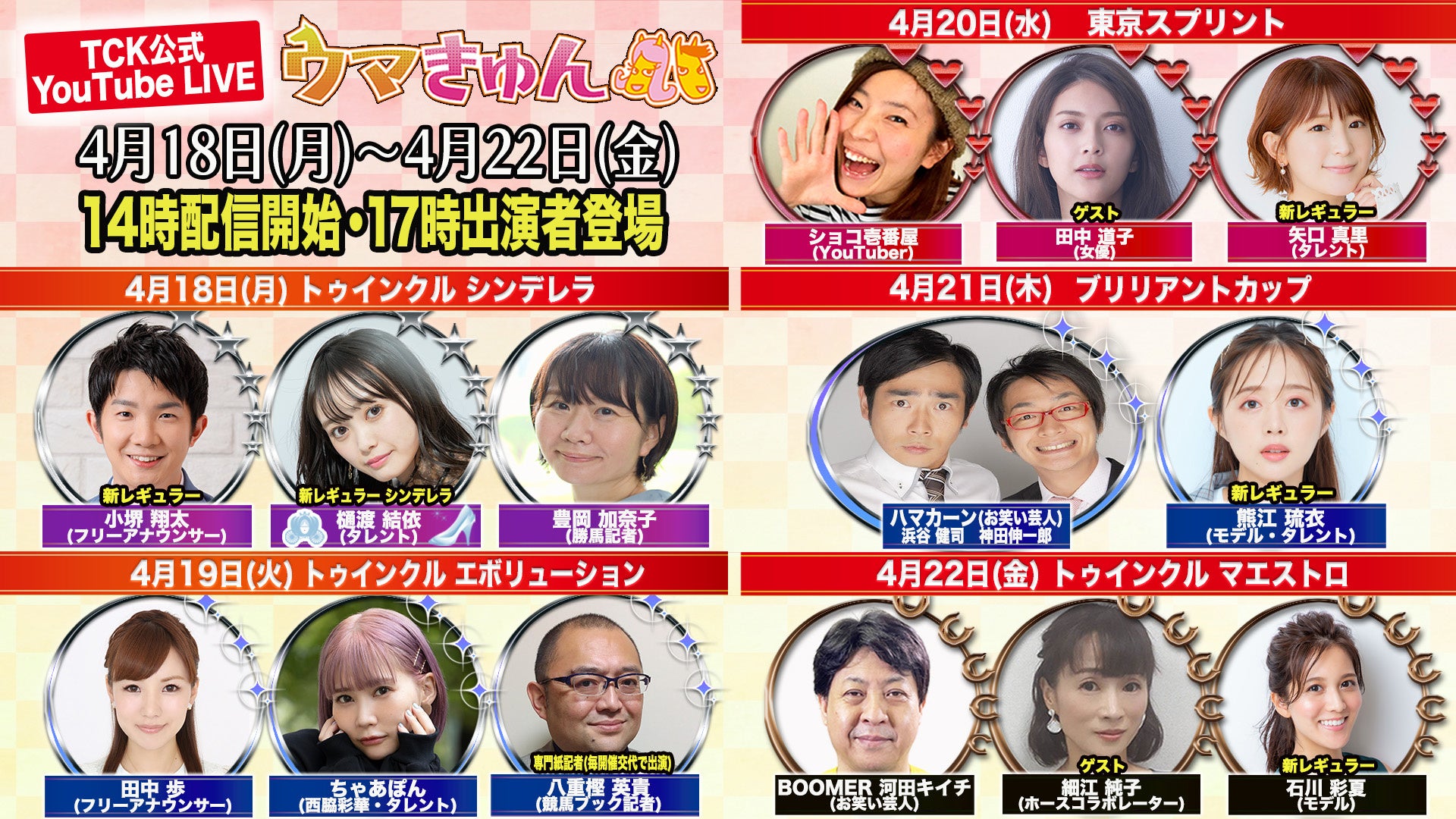 そのほか、月曜日にフリーアナウンサーの小堺翔太さん、タレントの樋渡結依さん。木曜日にモデルでタレントの熊江琉衣さん。金曜日にモデルの石川彩夏さんが新たにレギュラーとして加入。さらにパワーアップした「ウマきゅん」をお供に、TCKをどうぞお楽しみください!