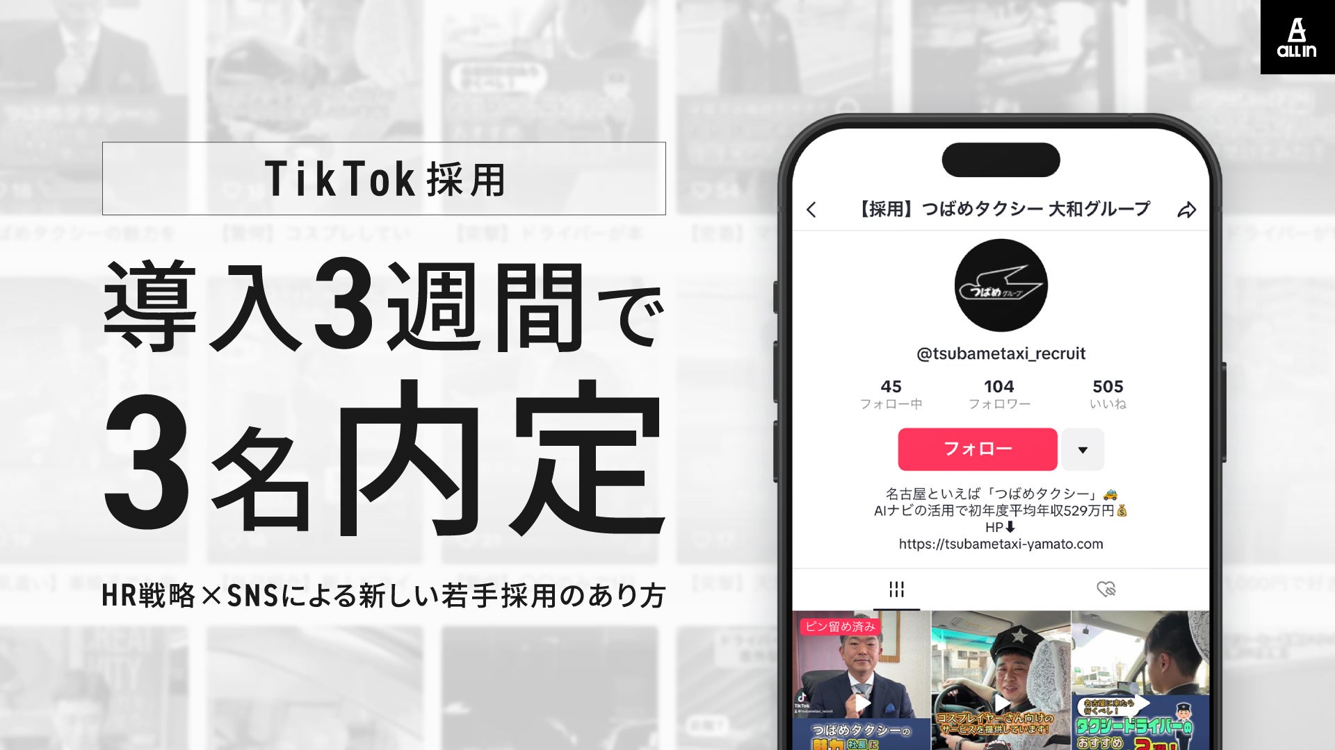 前述した背景から、今回デジタルやソーシャル領域に強みを持つ株式会社FOR YOUと、HR戦略コンサルティングを生業とするオールイン株式会社による初の共同プロジェクトが実現。愛知県で知名度を誇るつばめタクシーグループ様の若手採用における、TikTok採用のプロジェクトがスタートしました。