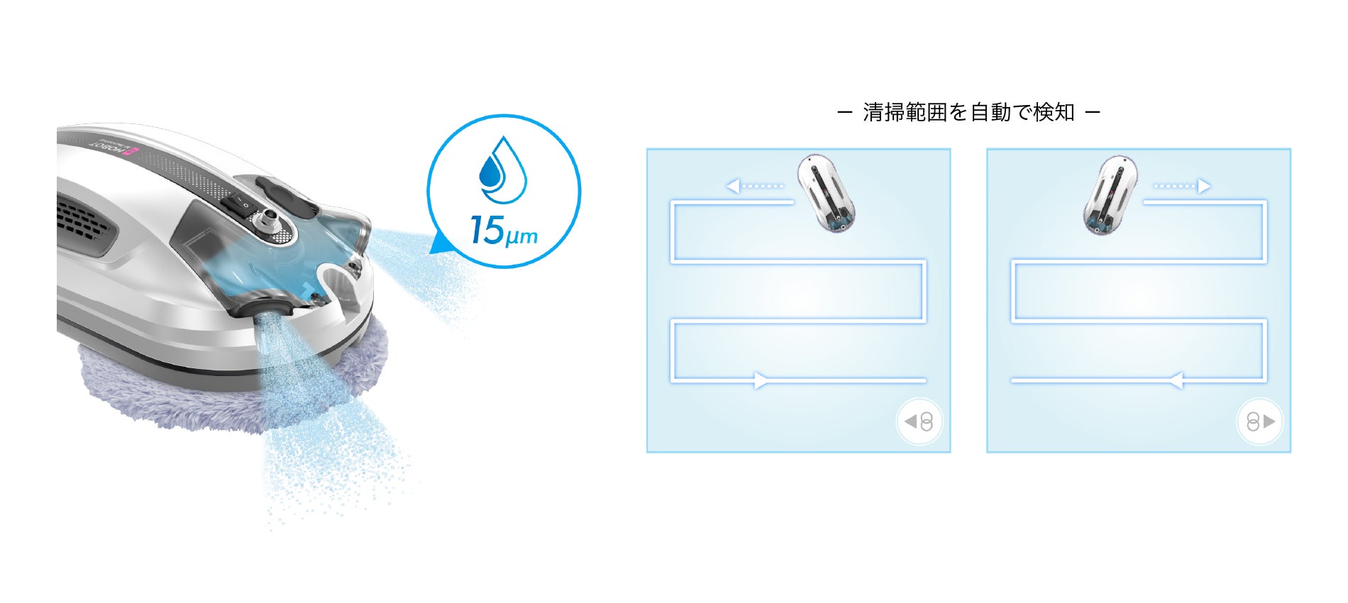 全自動モードでは本製品の内部や裏側に搭載されたセンサーにより窓枠や窓枠のないガラス面でも安全に清掃ルートを検知します。また、本製品より搭載されたデュアル超音波式スプレーがロボットの進行方向に洗剤を噴霧して効率的に清掃を進めます。