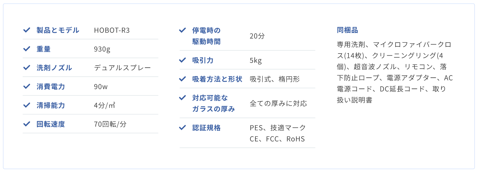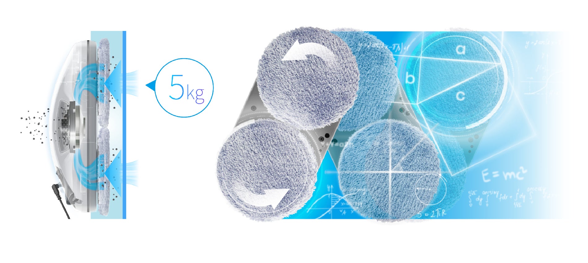 窓ガラスへの吸引力は5kgと製品重量955gの約5倍以上の力でガラス面に吸着し、マイクロファイバー製の2つの清掃パッドを交互に回転させて窓ガラスを磨き上げます。一般的なリビンングの窓では99%以上の範囲を徹底的に清掃し、清掃時間は約分で完了いたします。