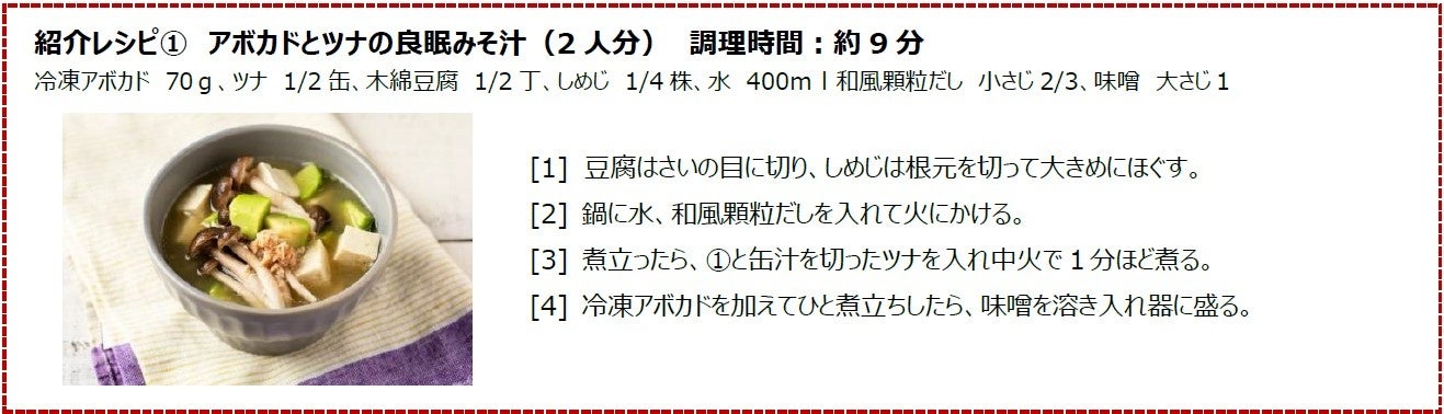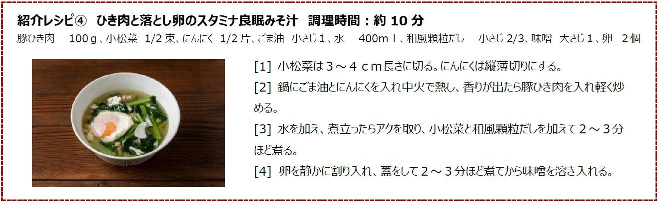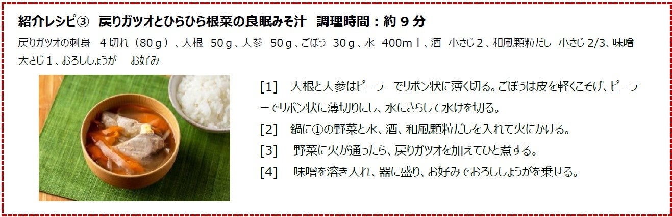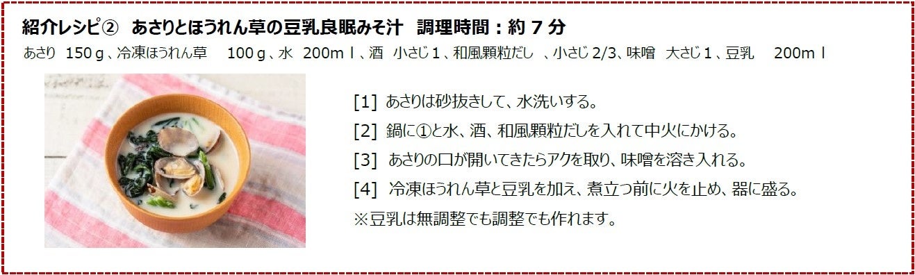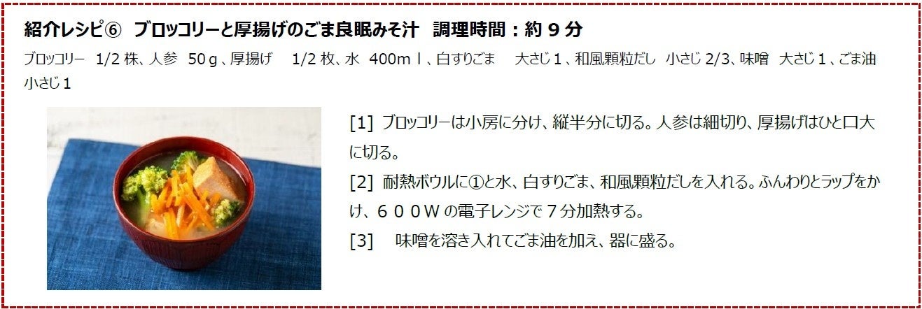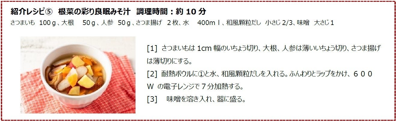 睡眠専門医・管理栄養士が選んだ不眠の対策にぴったりな食材を中心に、戻りガツオやさつまいも、しめじ等の季節感を感じられる具材を使った「良眠みそ汁」レシピを全6品開発しました。冷凍野菜や顆粒だしを使って10分以内に作れる時短レシピであるほか、価格が安定しているきのこ類などを使うことでコスパも抜群です。“レンジだけ”で調理できるレシピもあります。