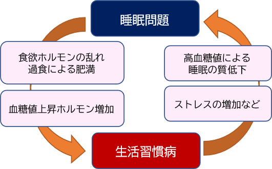 ミソドが50-60代の男女800名に実施した調査で、「現在睡眠に課題や懸念を感じているか」聞いたところ、 「感じている」 「やや感じている」 と回答した人が合わせて54%と全体の半数を超えていることが分かりました。さらに、「加齢とともに睡眠に課題/懸念を実感しているか」という質問には5割以上の人が 「加齢とともに課題として感じている」 「やや感じている」 と回答しています。質の良い睡眠に重要なのは睡眠ホルモンの「メラトニン」ですが、ミドルシニアはメラトニンの分泌量が減る傾向があり、睡眠の質に悪影響をもたらします。元来ミドルシニアは不眠の悩みを抱えやすいとされており、特に50代の女性は女性ホルモンの急激な減少により男性よりも睡眠に不満を感じる人が多いと言われています。さらに日照時間が少なく外出や運動の機会が減る冬場はメラトニンの分泌が減少しやすいため一層の注意が必要です。不眠と生活習慣病の「負のスパイラル」