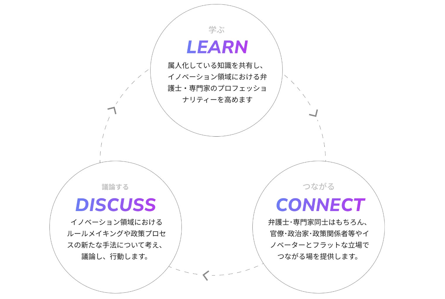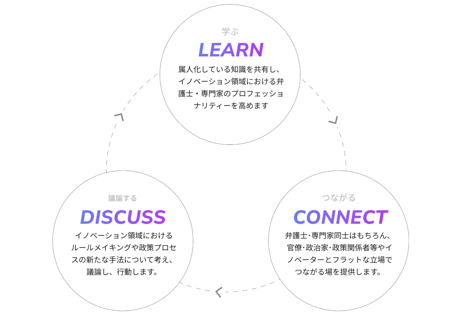 つながる:弁護士・専門家同士はもちろん、官僚・政治家・政策関係者等やイノベーターとフラットな立場でつながる場を提供します。